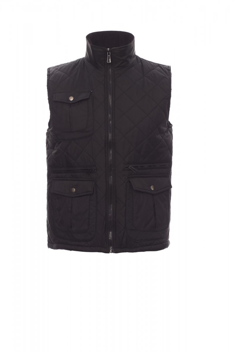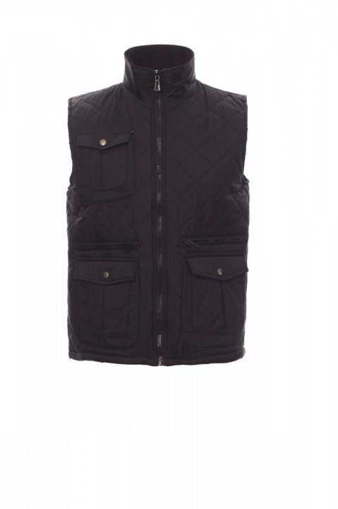 Men’s quilted vest, 8 mm plastic zip with metal pull, side vents with button, five outer pockets, two with LOCK SYSTEM. Padded, corduroy rib inside collar, one inner pocket.