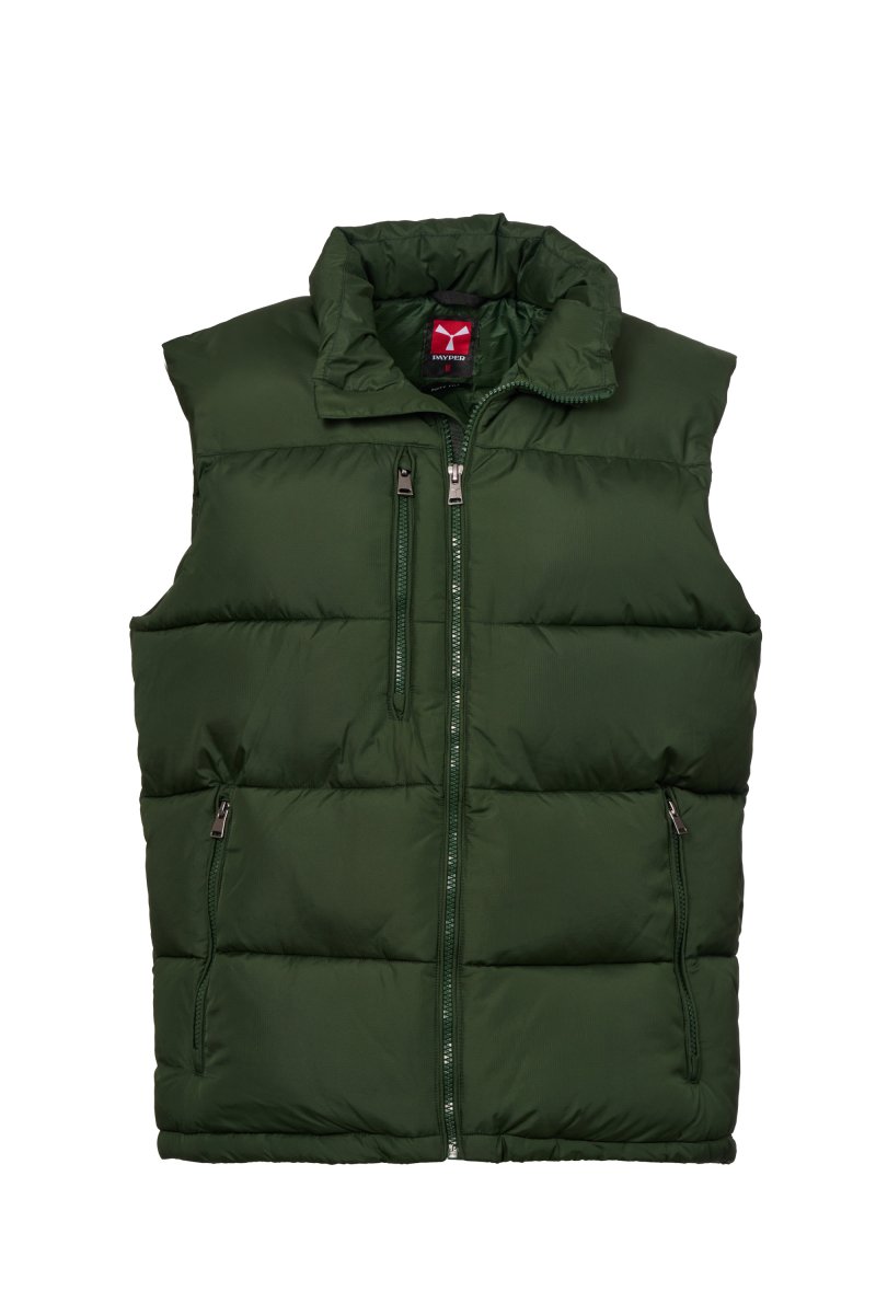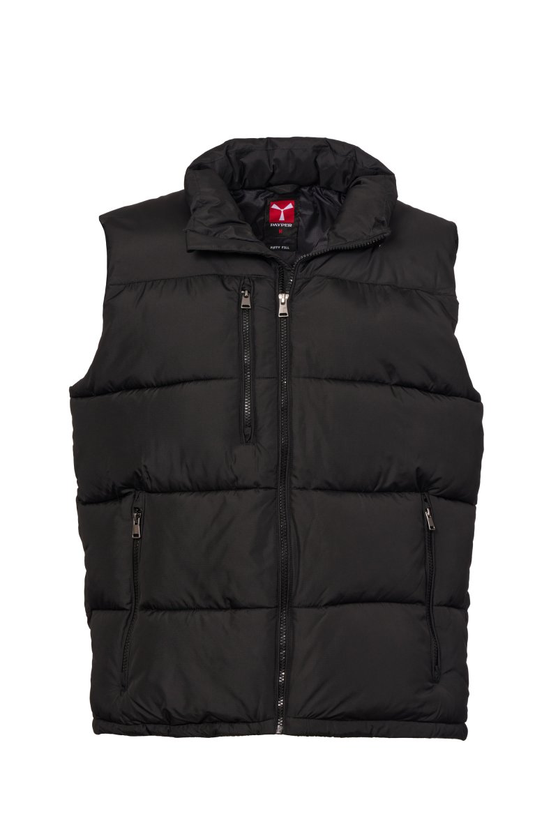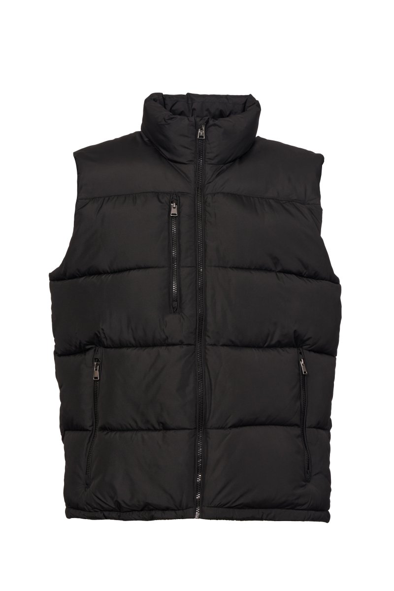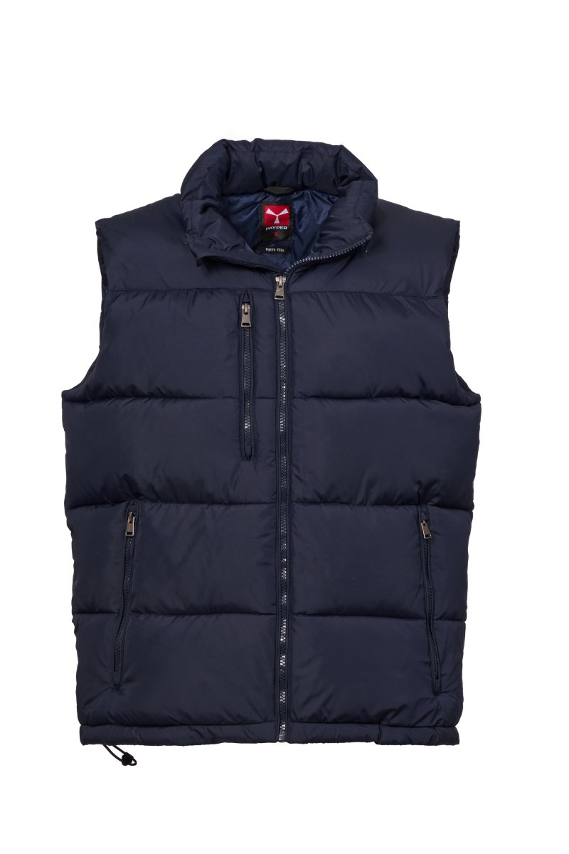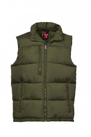 Men's vest with free-fibre padding (300g/m²), plastic zip with customised metal slider with propeller. Inner zip pocket. Two side pockets and one chest pocket with zip. Tone-on-tone piping. Adjustable bottom with drawstring.