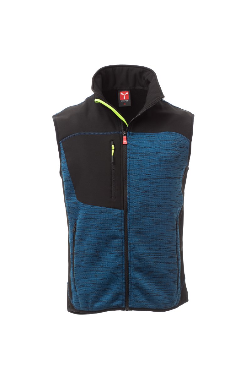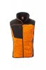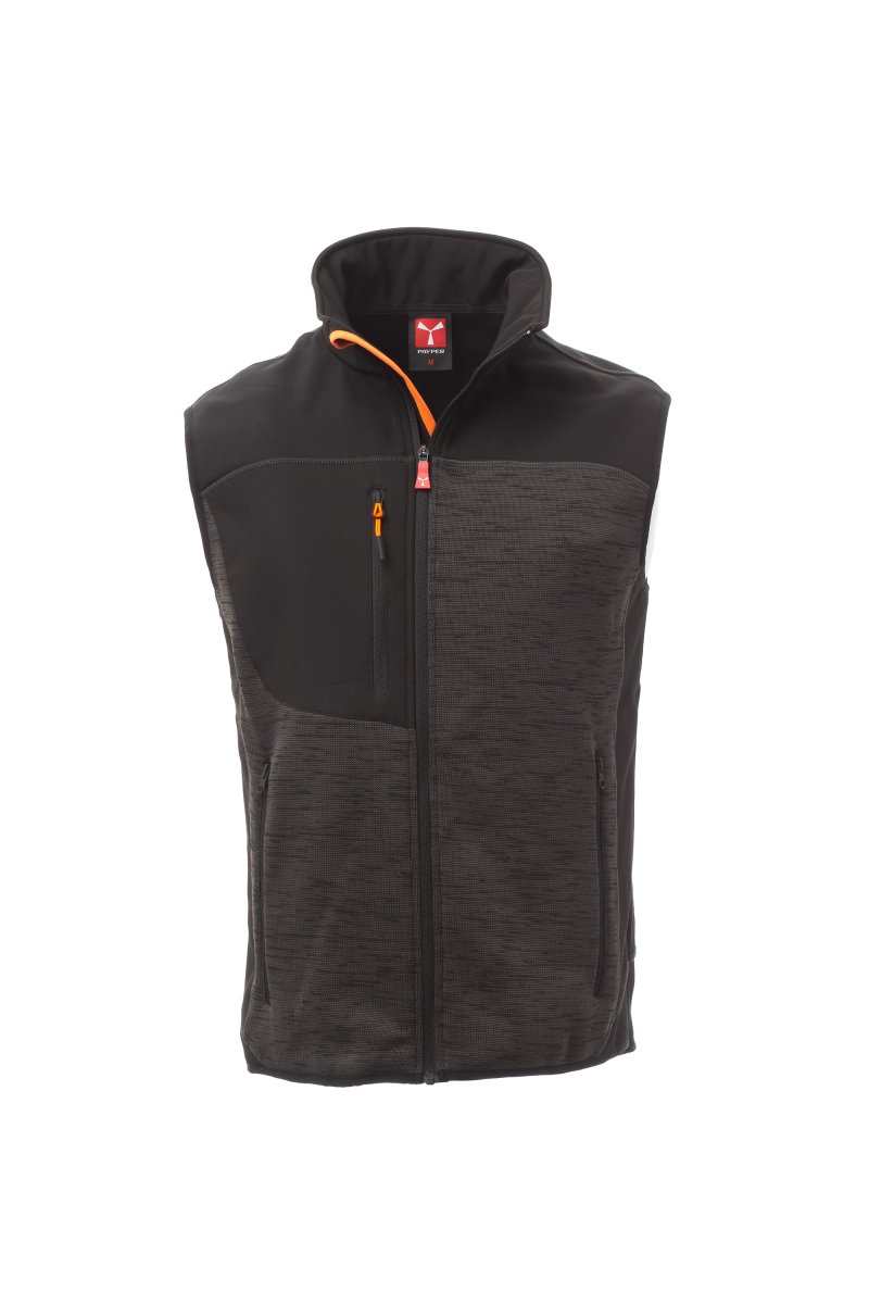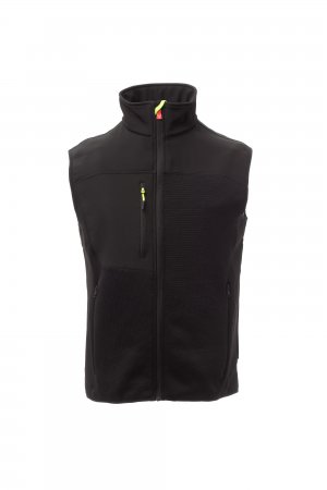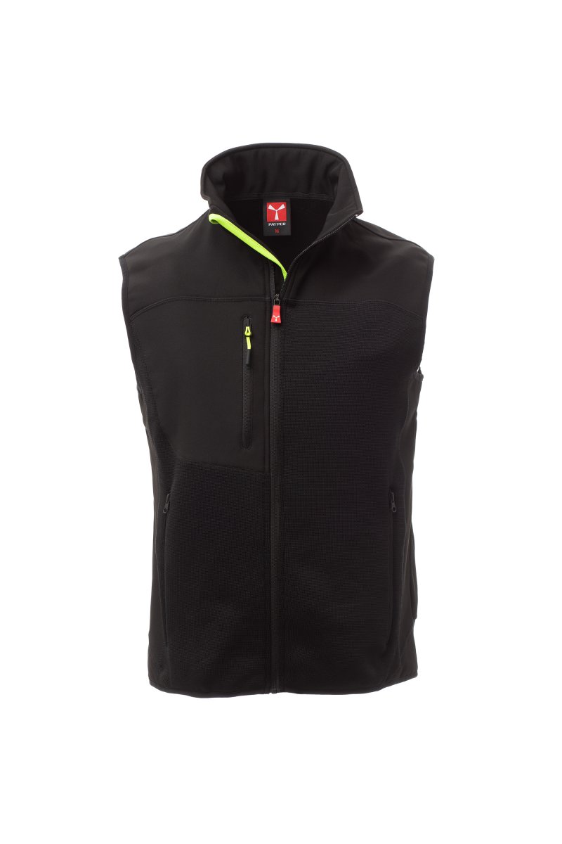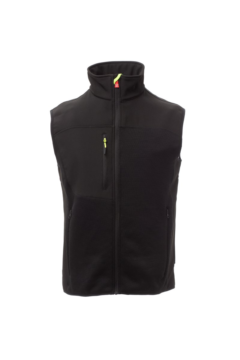 Technical fabric vest with black soft-shell inserts, two-tone, zip closure with "semi-auto lock" metal slider and customised pull. Thin edge on the armhole and waist, two side pockets with zip, one breast pocket.