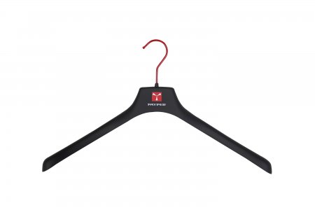 Coat hanger with broad sweeping arms for a better fit, flat neck with printed logo, soft-touch slightly non-slip rubber coating.