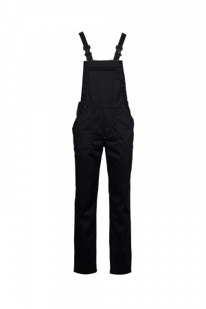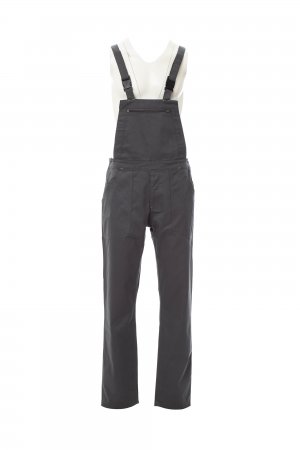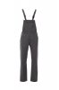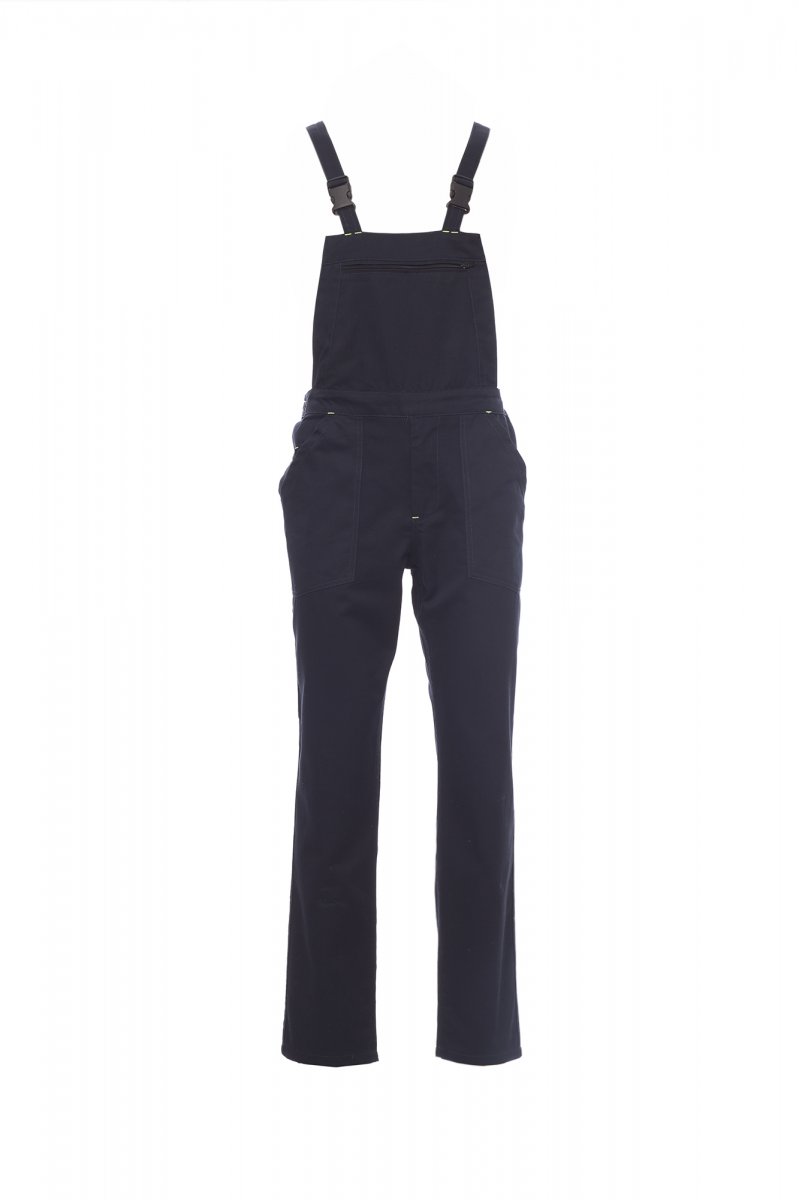 Bib overall with extensive renal protection, elastic braces and buckle with snap closure, side opening with buttons and flap closure with zip, elasticated waistband. Double seams on the crotch and inside leg. Chest pocket with badge holder and zip closure, two front pockets and pen holder pocket, right side tape measure pocket and a back pocket with hook-and-loop flap.