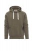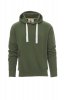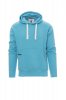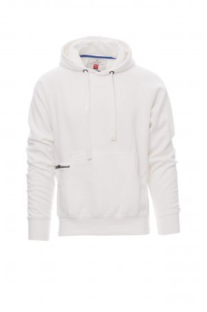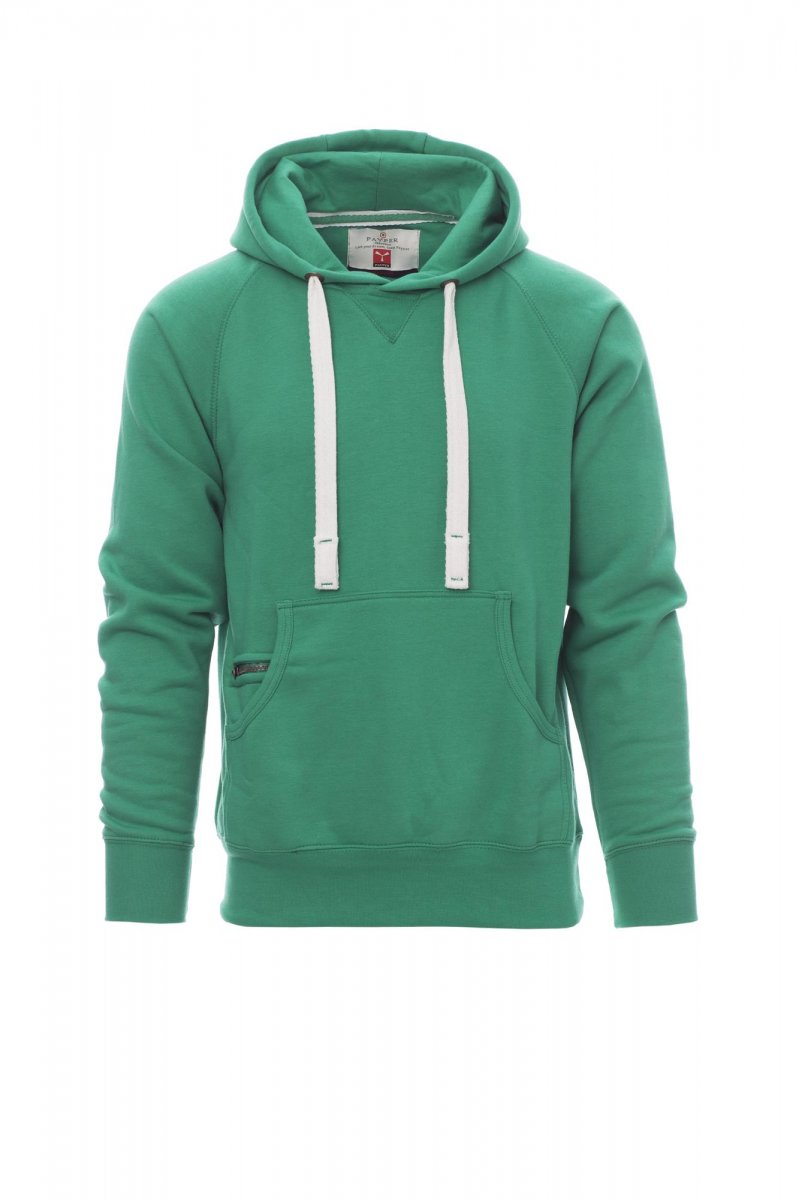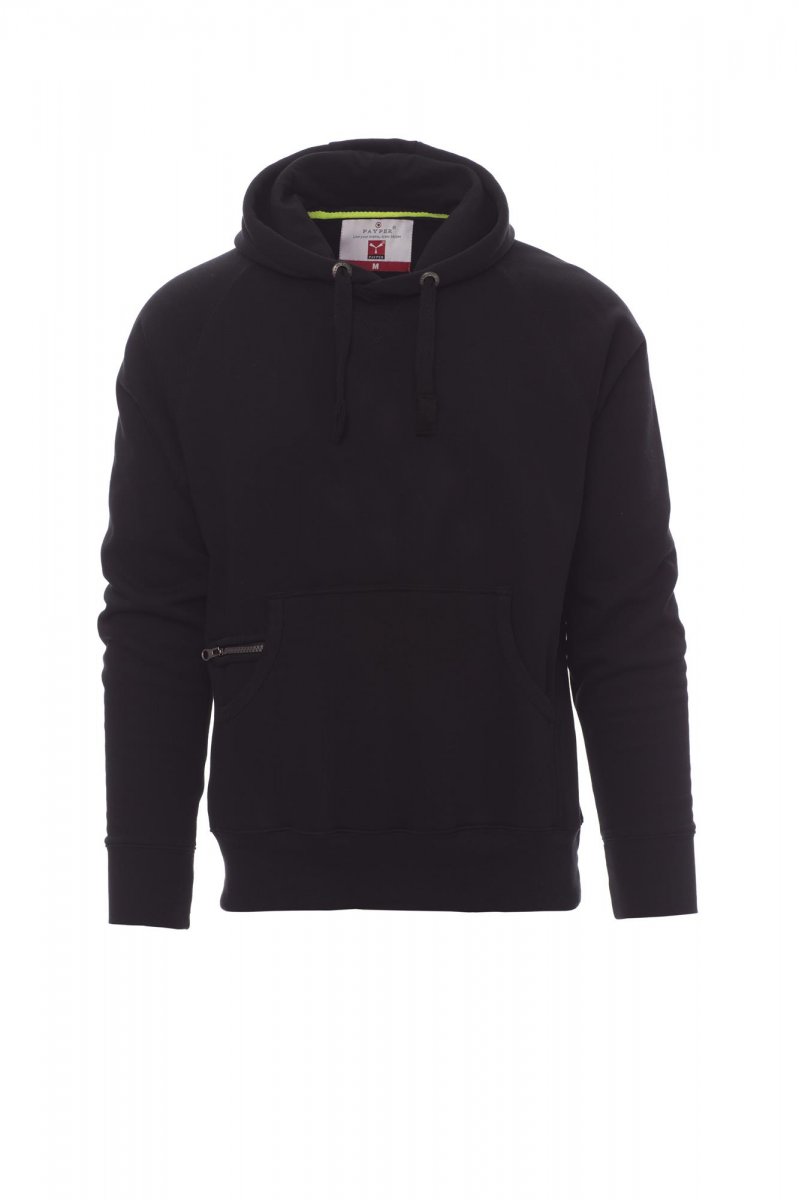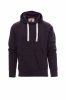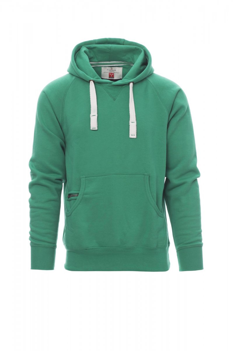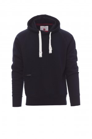 Men’s hoodie with double stitched seams and white drawstring with contrasting stitching and metal rings, raglan sleeves, V-design neck stitching, kangaroo pockets, small zip pocket, stretch rib cuffs and hem, reinforced seams.