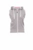 Women's sleeveless hoodie, full plastic zip in contrasting colour with double metal pull, shaped hood and drawstring in contrasting colour, kangaroo pocket with small zip pocket.