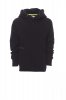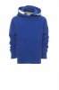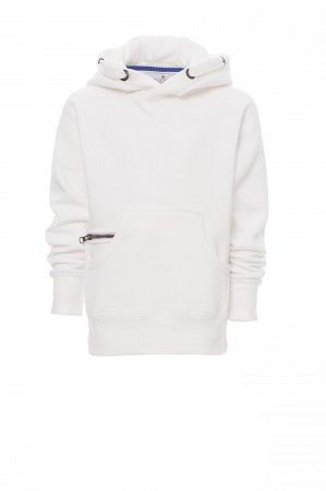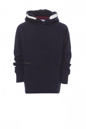 Children’s/boy’s hoodie, hood with double stitched seams, white drawstring with matching stitching closed with double metal rings, raglan sleeves, decorative V-stitching at the neck, small kangaroo pocket, stretch rib cuffs and hem, reinforced seams.