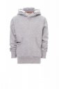 Children’s/boy’s hoodie, hood with double stitched seams, white drawstring with matching stitching closed with double metal rings, raglan sleeves, decorative V-stitching at the neck, small kangaroo pocket, stretch rib cuffs and hem, reinforced seams.