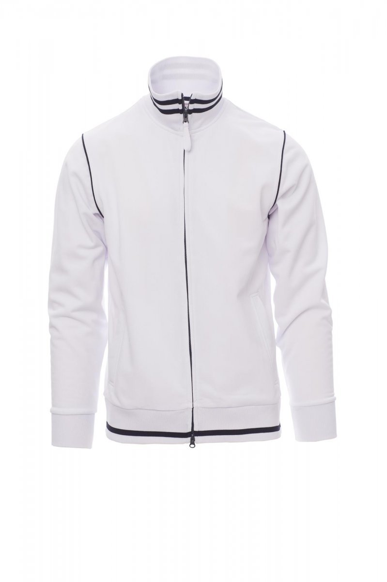 Men’s sweatshirt with full, contrasting plastic-covered zip with double metal pull. Rib collar and hem with contrasting trim, stretch rib cuffs, cuff piping, two side pockets with zip, reinforced seams, pique type fabric for greater breathability.