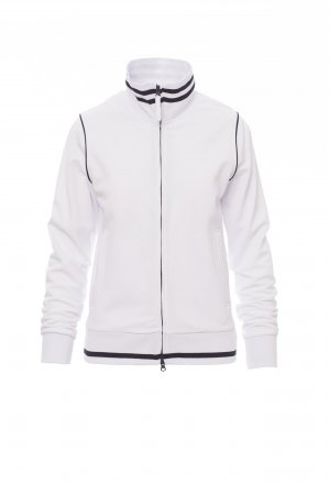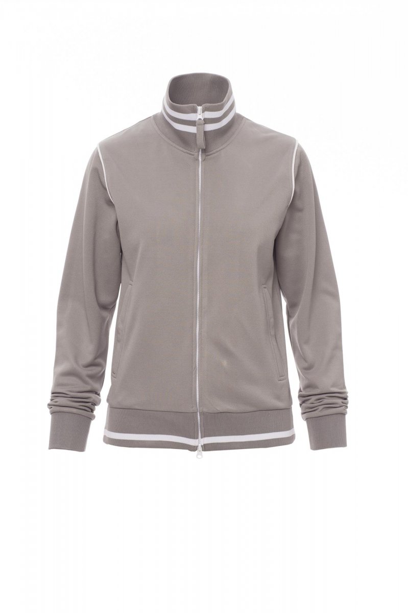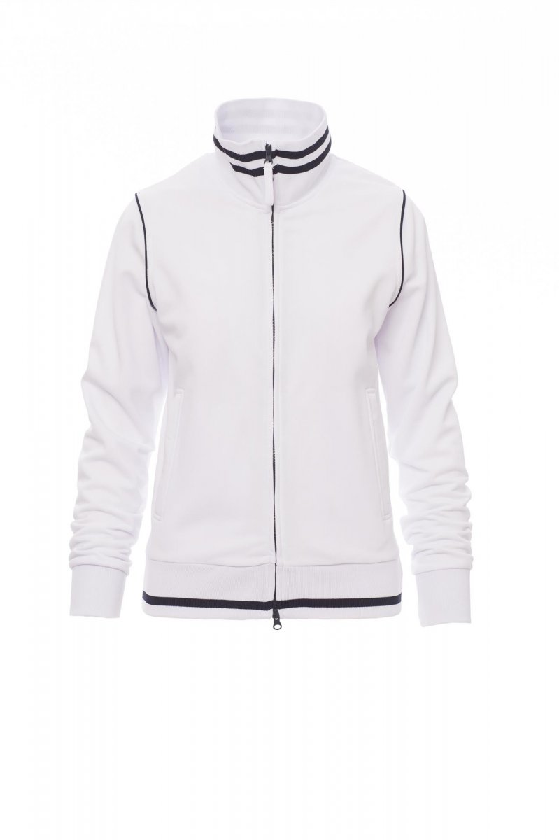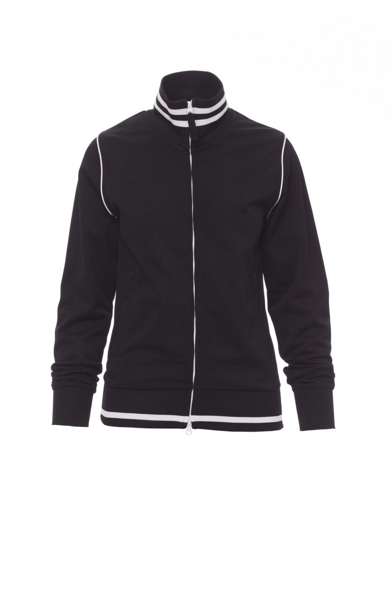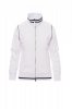 Women’s fitted sweatshirt with full, contrasting plastic-covered zip with double metal pull. Rib collar and hem with contrasting trim, stretch rib cuffs, cuff piping, two side pockets with zip, reinforced seams, pique type fabric for greater breathability.