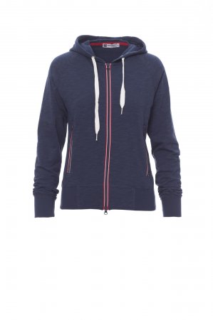 Women’s fitted hoodie, full contrasting nylon zip, raglan sleeves, hood with contrasting colour drawstring, contrasting inner neck tape, stretch rib cuffs and hem and two front pockets with zip.