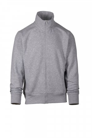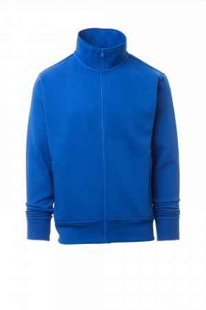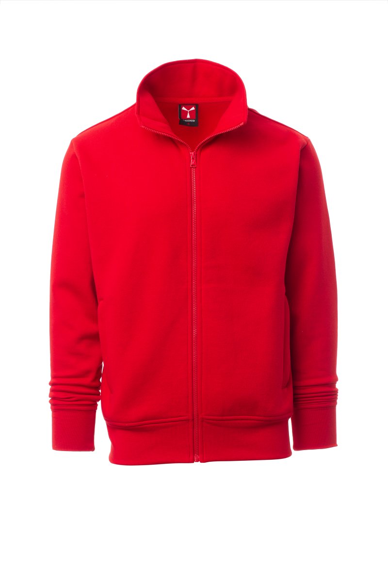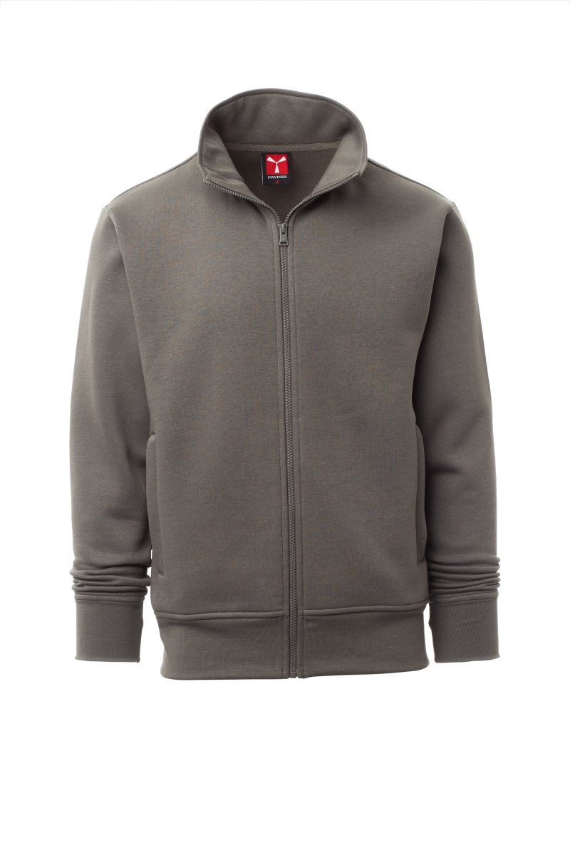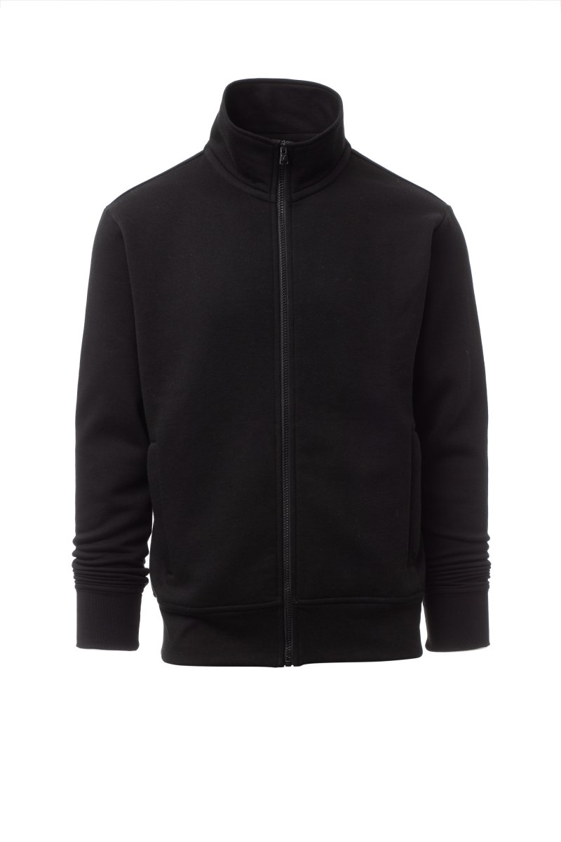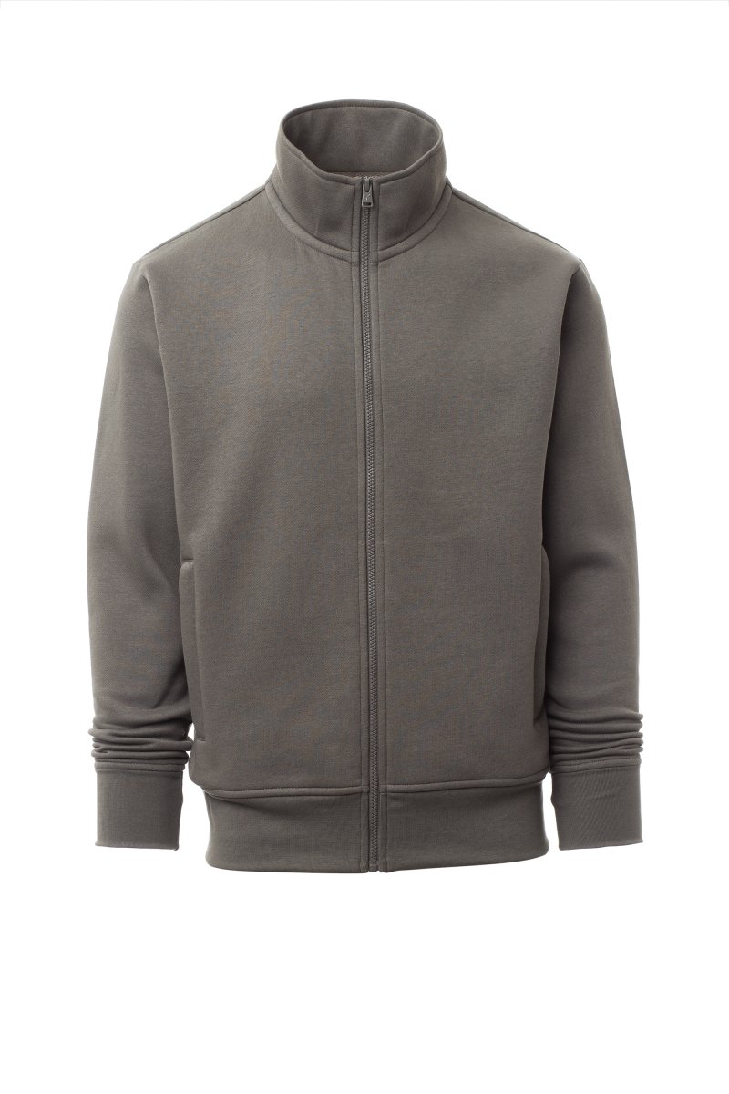 Men’s sweatshirt, with matching full zip in plastic with single customised pull, fitted sleeves, two welt pockets with zip, stretch rib cuffs and hem, reinforced seams, matching inner neck tape reinforcement.