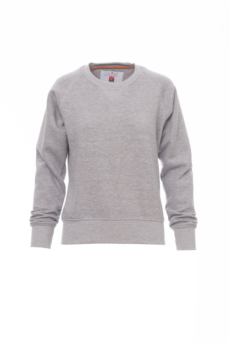 Women’s crew neck sweatshirt, with raglan sleeves, V-design neck stitching. Stretch rib cuffs and hem, reinforced seams.