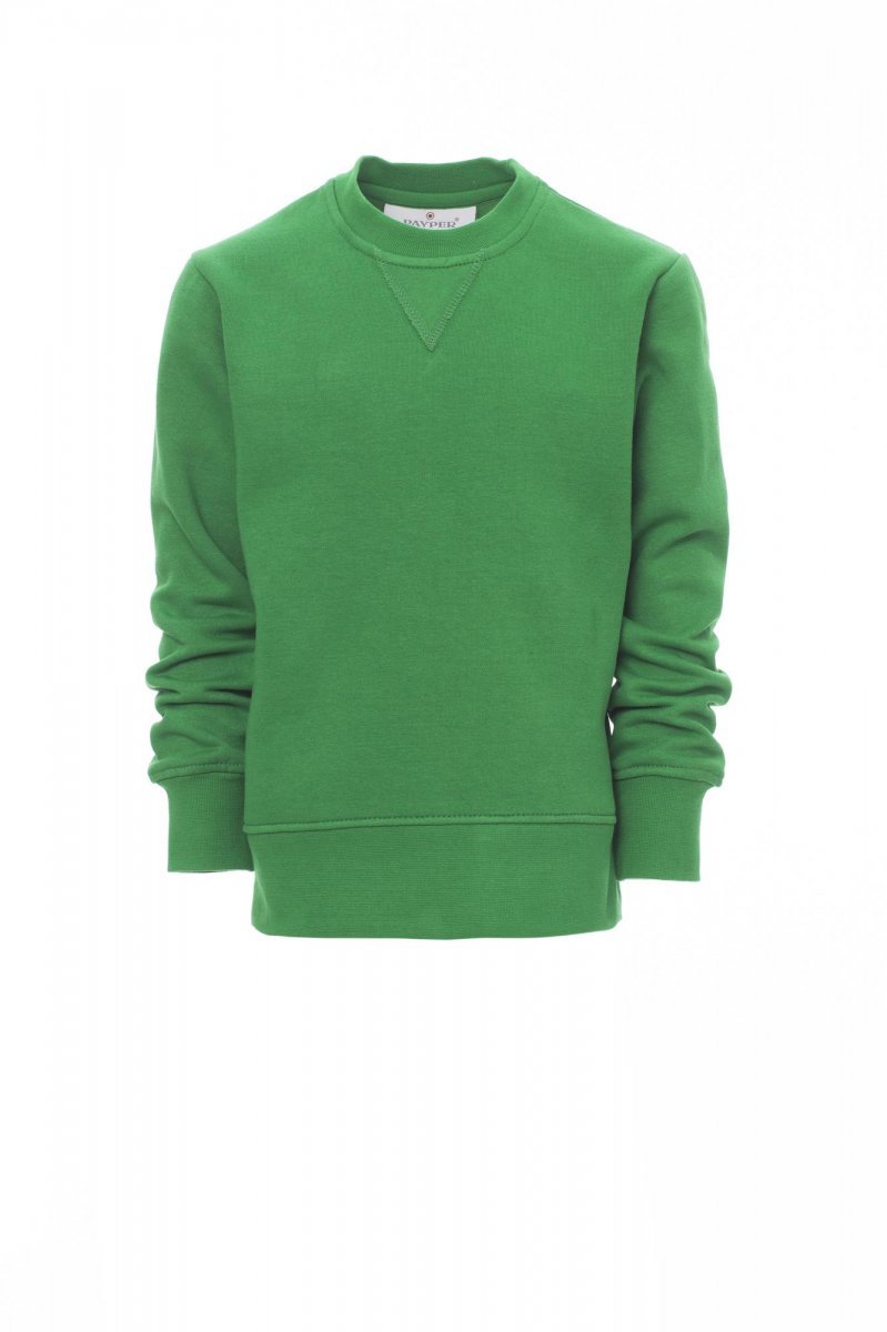 Children’s crew neck sweatshirt, V-design neck stitching, fitted sleeves, stretch rib cuffs and hem, reinforced seams.