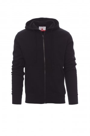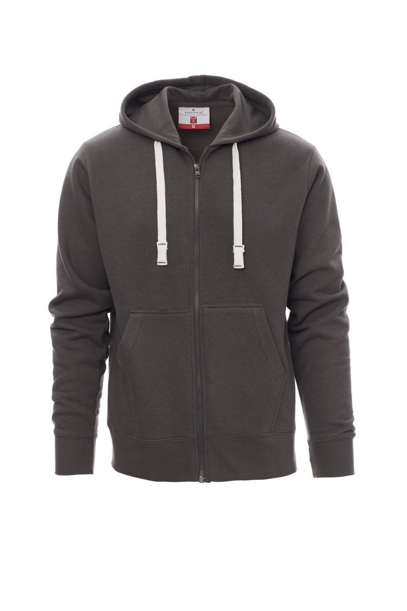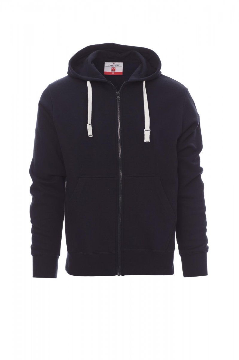 Men’s hoodie with full plastic zip with single metal pull, hood and matching colour drawstring, fitted sleeves, kangaroo pockets, stretch rib cuffs and hem. Reinforced seams, matching reinforced inner neck tape.