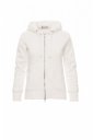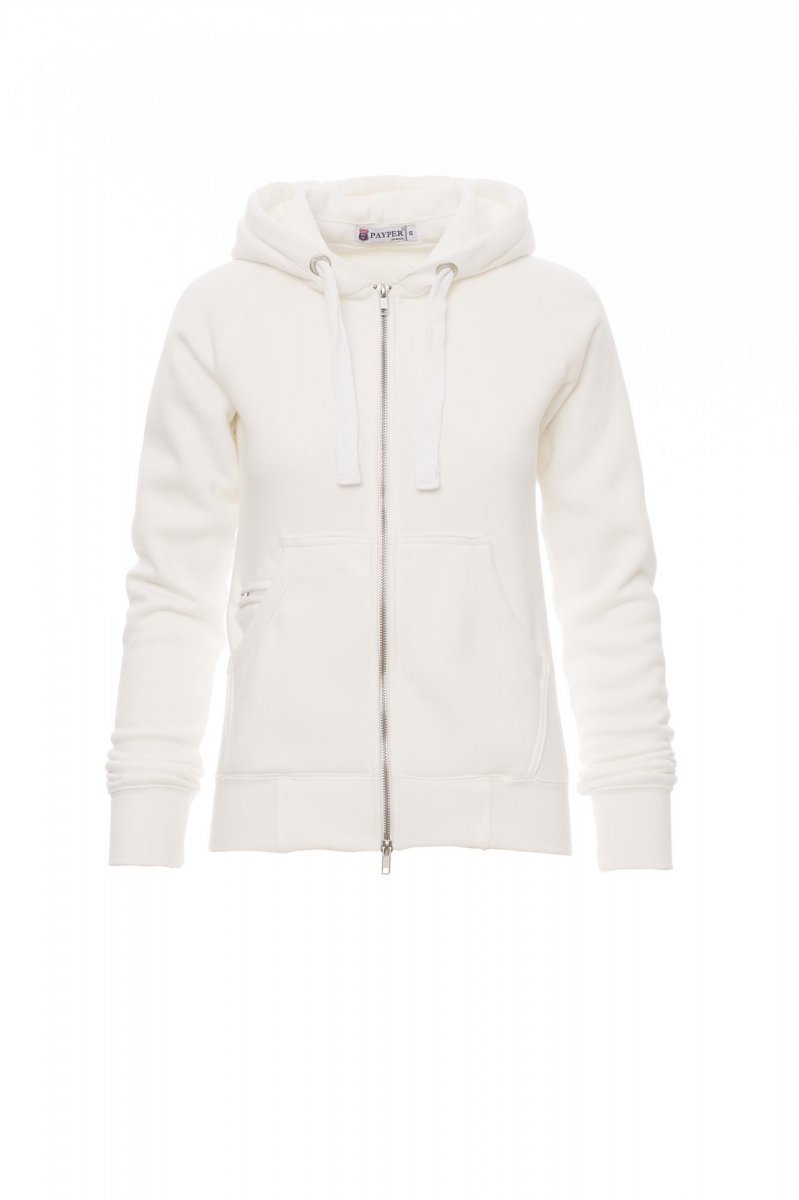 Women’s fitted hoodie with full metal zip and double pull, raglan sleeves, hood with white drawstring with contrasting stitching and metal rings, kangaroo pockets, small zip pocket with opening for mp3/mobile phone lead, stretch rib cuffs and hem, reinforced seams. White mélange effect (black for Bordeaux).