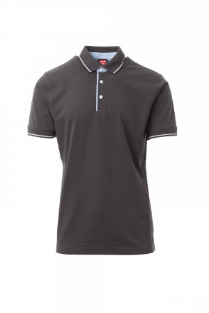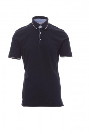 Men’s short-sleeved polo shirt with 3 white buttons, inside collar, flap and side vents in Oxford blue, rib collar and sleeve edging with fine contrasting trim, underarm eyelets, side vents with reinforced seams, side reinforcement tape, stretch seams, inner neck tape