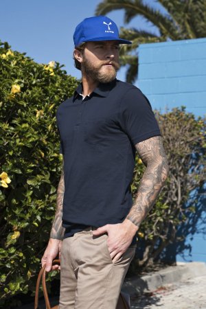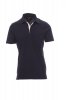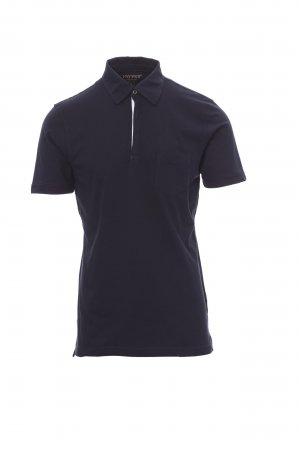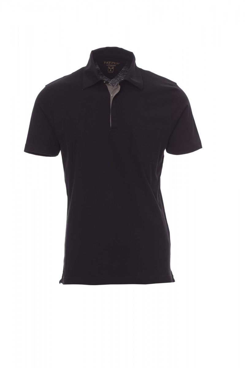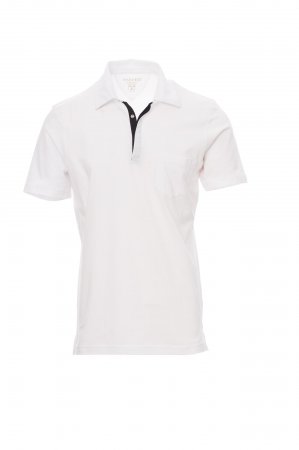 Men’s short-sleeved polo shirt with three, snap fasteners, low neck, pocket, shirt-style jersey collar, transfer label, inner neck tape