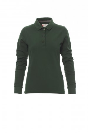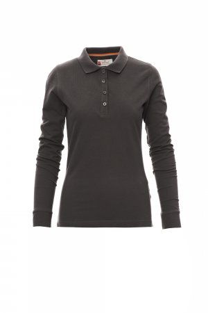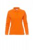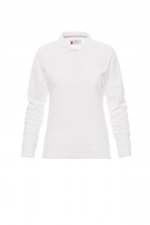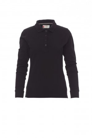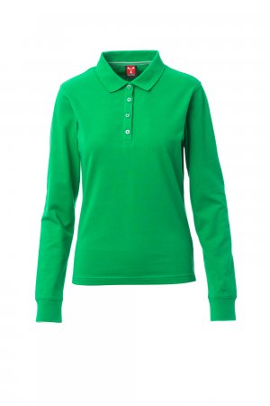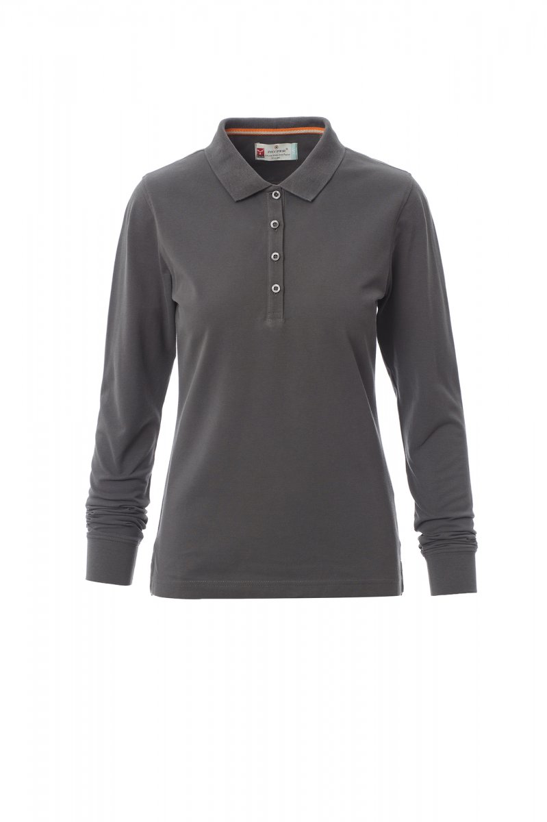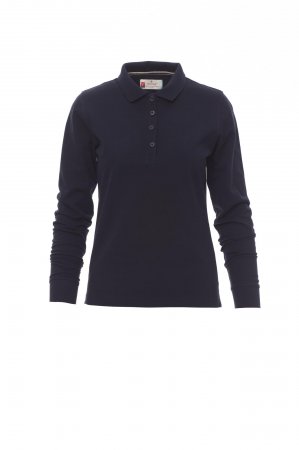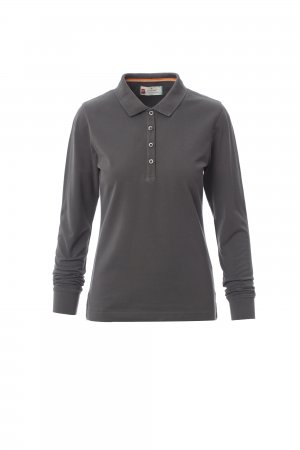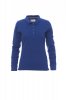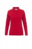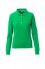 Women’s long-sleeved fitted polo shirt with 4, matching, mother-of-pearl effect buttons, rib collar and sleeve edging, side vents, concealed collar stitching with contrasting tape, stretch seams, side reinforcement tape, inner neck tape.