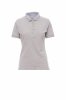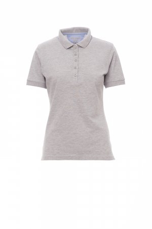 Women’s short-sleeved fitted polo shirt with 5, matching, mother-of-pearl effect buttons, rib collar and sleeve edging, light blue poplin inserts on the inside collar, side vents, label transfer, inner neck tape.