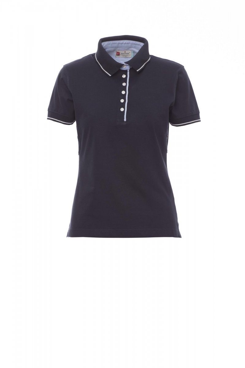 Women’s short-sleeved fitted polo shirt with 6 white buttons, inside collar, flap and side vents in Oxford blue, rib collar and sleeve edging with fine contrasting trim, underarm eyelets, side vents with reinforced seams, side reinforcement tape, stretch seams, inner neck tape