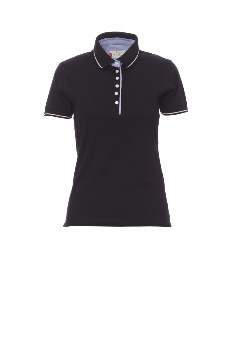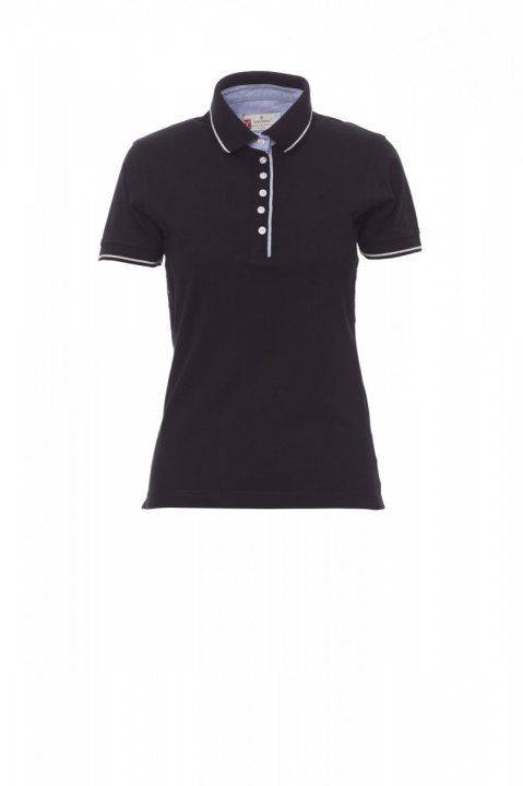 Women’s short-sleeved fitted polo shirt with 6 white buttons, inside collar, flap and side vents in Oxford blue, rib collar and sleeve edging with fine contrasting trim, underarm eyelets, side vents with reinforced seams, side reinforcement tape, stretch seams, inner neck tape