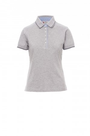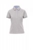 Short sleeve tailoured women’s polo shirt with six white buttons, inside of neck, placket and side vents in Oxford blue, rib collar and sleeve edge with fine contrasting trim, eyelets under the arms.