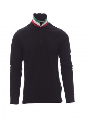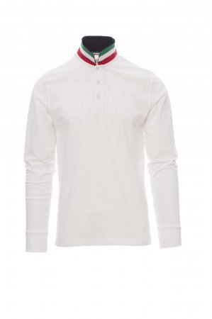 Men’s long-sleeved polo shirt with 3, matching, mother-of-pearl effect buttons, matching collar, with contrasting underside (colours of the flag). Inner button flap and side vents with colours of the flag, rib collar and sleeve edging, concealed collar stitching, side reinforcement tape, inner neck tape.
