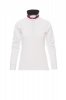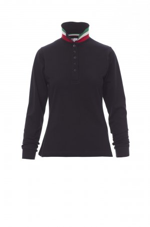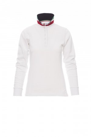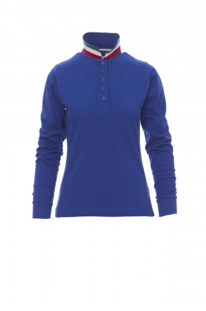 Women’s long-sleeved fitted polo shirt with 5, matching, mother-of-pearl effect buttons, matching collar, with contrasting underside (colours of the flag). Inner button flap and side vents with colours of the flag, rib collar and cuffs, concealed collar stitching, side reinforcement tape.