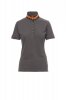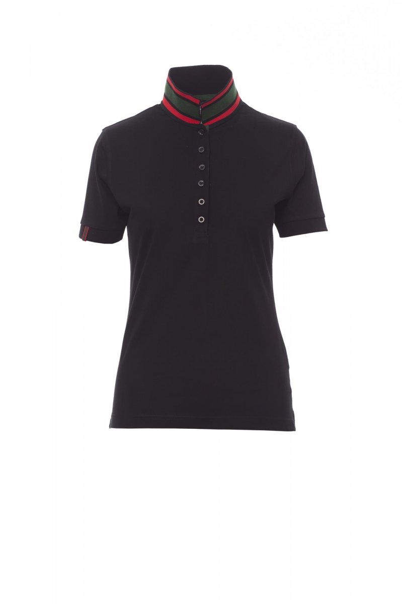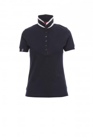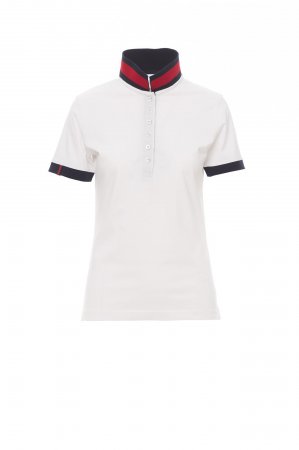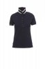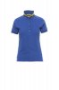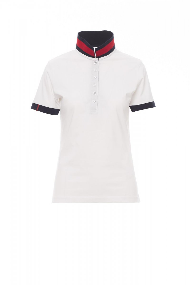 Women’s short-sleeved fitted polo shirt with 6, matching, mother-of-pearl effect buttons, matching collar with contrasting colour underside. Contrasting inner button flap and side vents, right sleeve edging with colour trim (same colour as collar), rib sleeve edging, concealed collar stitching with contrasting tape, side reinforcement tape, inner neck tape.