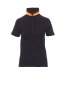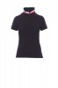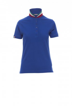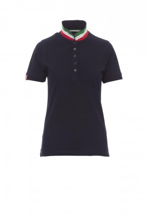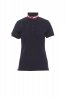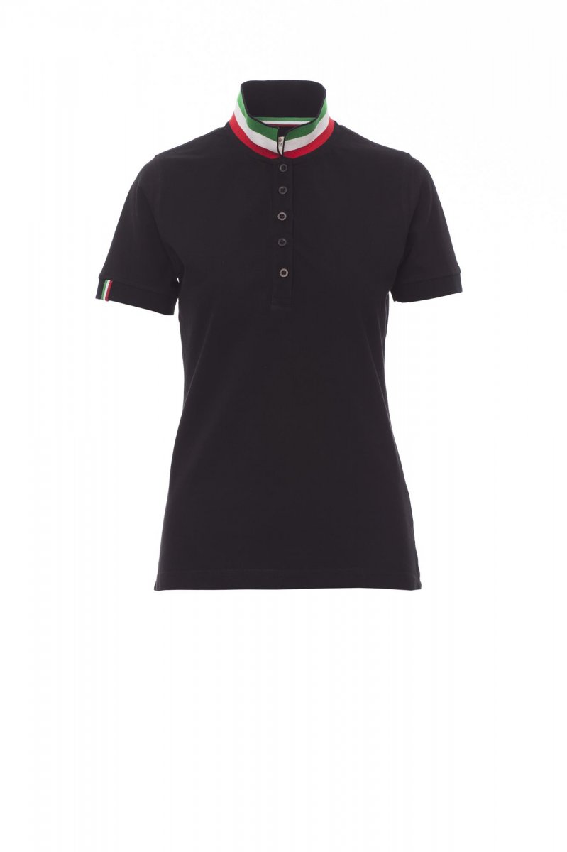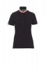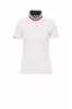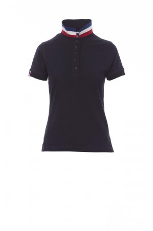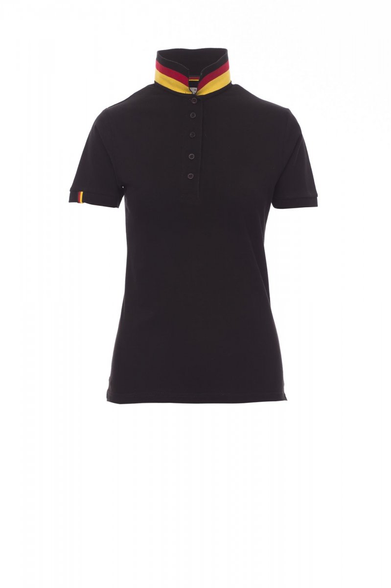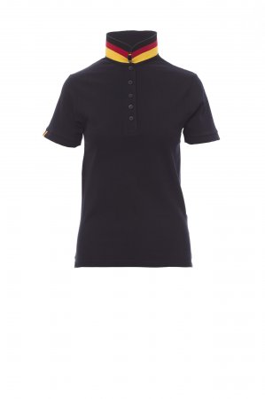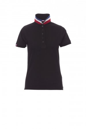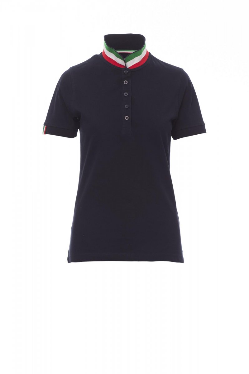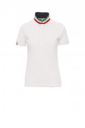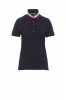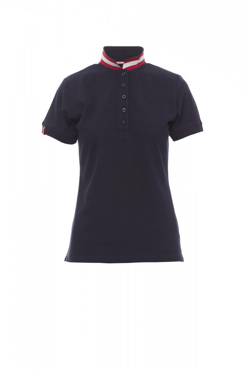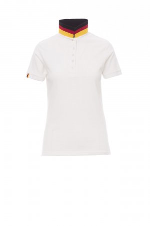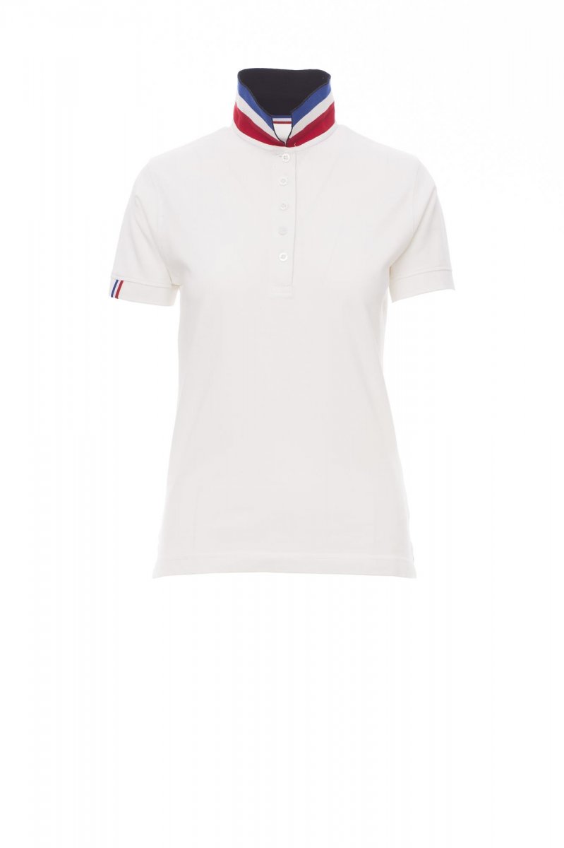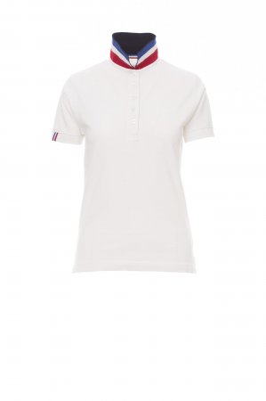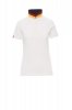 Women’s short-sleeved fitted polo shirt with 5, matching, mother-of-pearl effect buttons, matching collar with contrasting underside (colours of the flag). Right sleeve edging with colour trim (same colour as collar), rib collar and sleeve edging, side vent trim with colours of the flag, concealed collar stitching with jersey tape (colours of the flag), side reinforcement tape, inner neck tape.