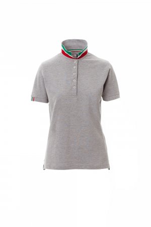 Women’s short-sleeved fitted polo shirt with 5, matching, mother-of-pearl effect buttons, matching collar with contrasting underside (colours of the flag). Right sleeve edging with colour trim (same colour as collar), rib collar and sleeve edging, side vent trim with colours of the flag, concealed collar stitching with jersey tape (colours of the flag), side reinforcement tape, inner neck tape