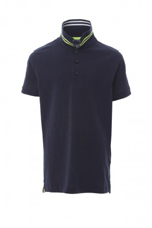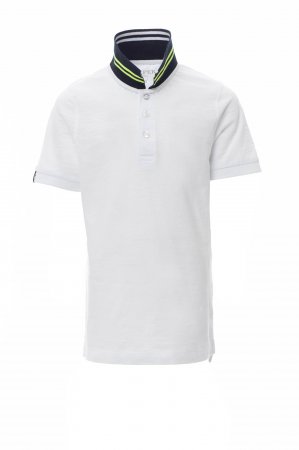 Children’s short-sleeved polo shirt with 3, matching, mother-of-pearl effect buttons, collar with contrasting stripes and fluorescent stripes on the underside, rib collar and sleeve edging, right sleeve with insert, side vents and concealed collar stitching with fluo tape, transfer label.