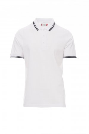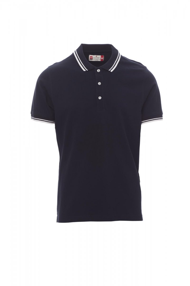 Men’s short-sleeved polo shirt with 3 white buttons, fine contrasting collar and sleeve trim, rib collar and sleeve edging, side vents with reinforced seams, concealed collar stitching, side reinforcement tape, stretch seams, inner neck tape.