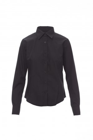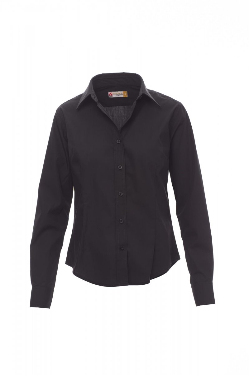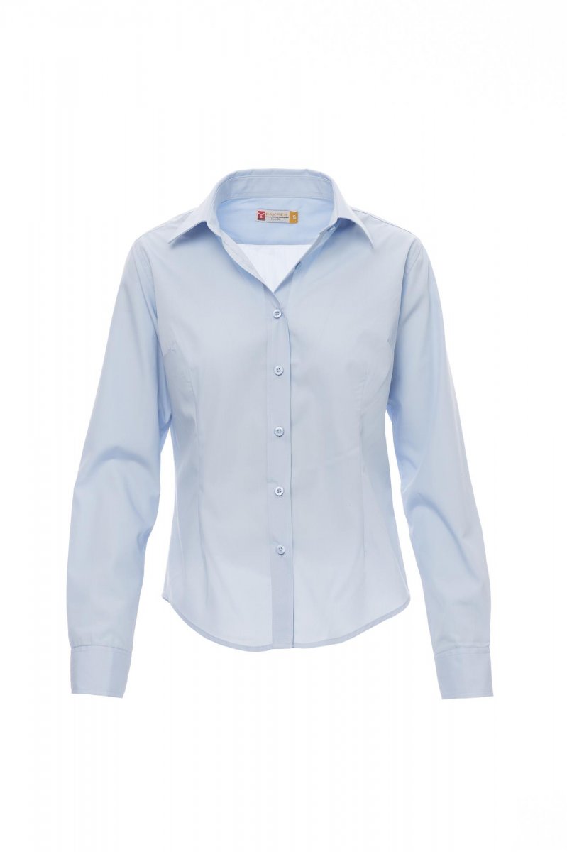 Women’s fine weave combed cotton fitted shirt, pleats at the front and back, Italian-style collar, tailored cuff with 2 buttons and button hole, stitched placket with matching buttons. With yoke. Easy-care fabric.