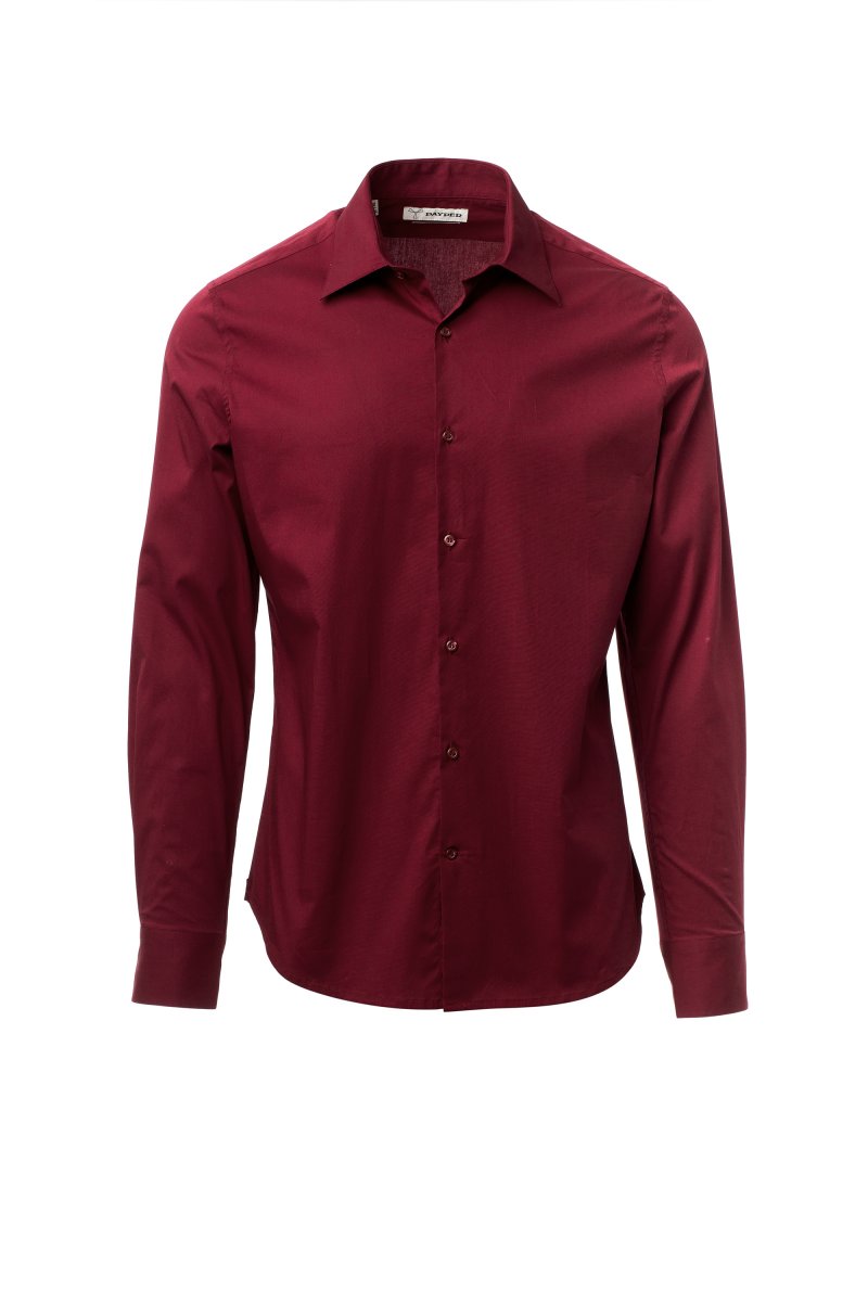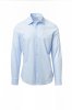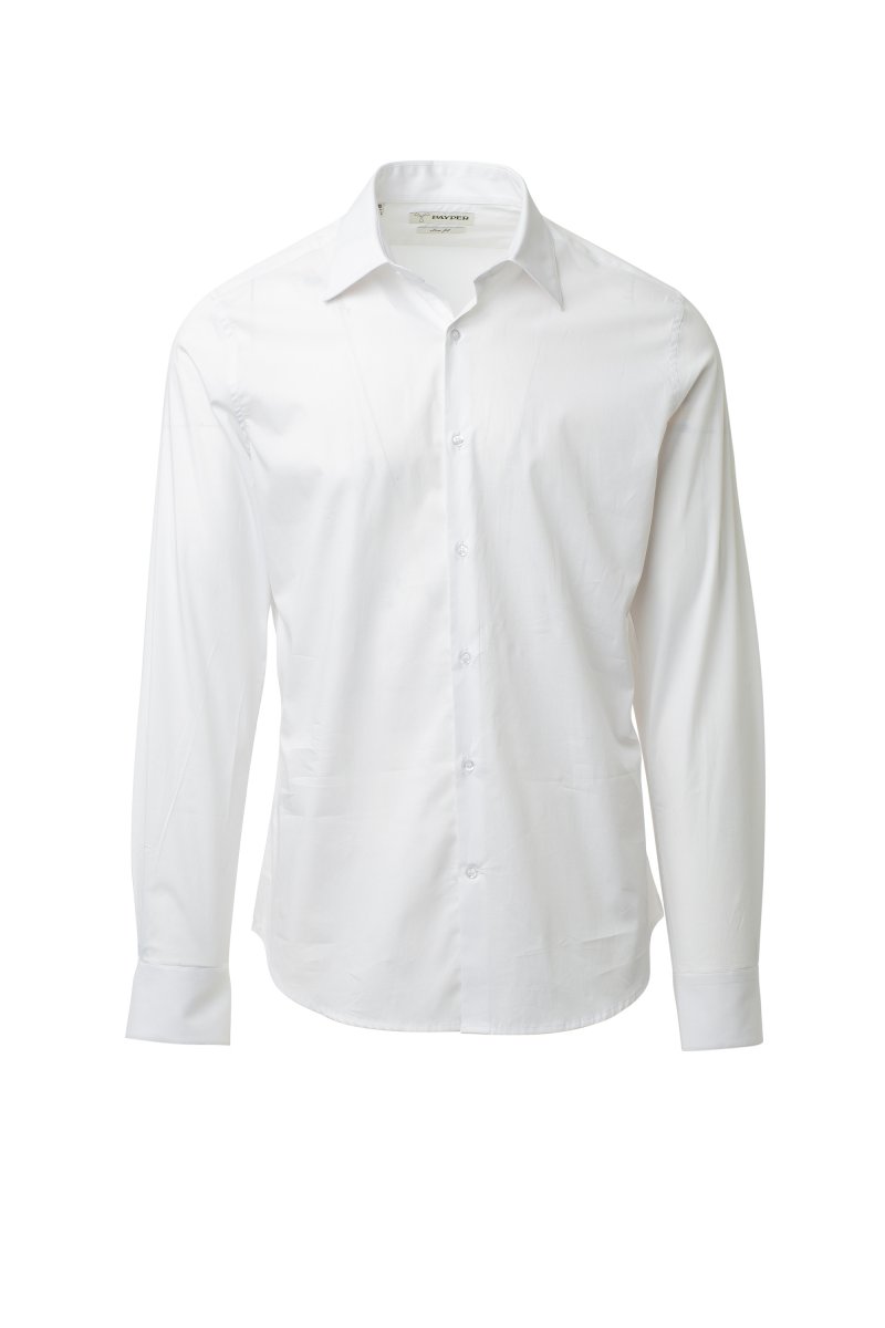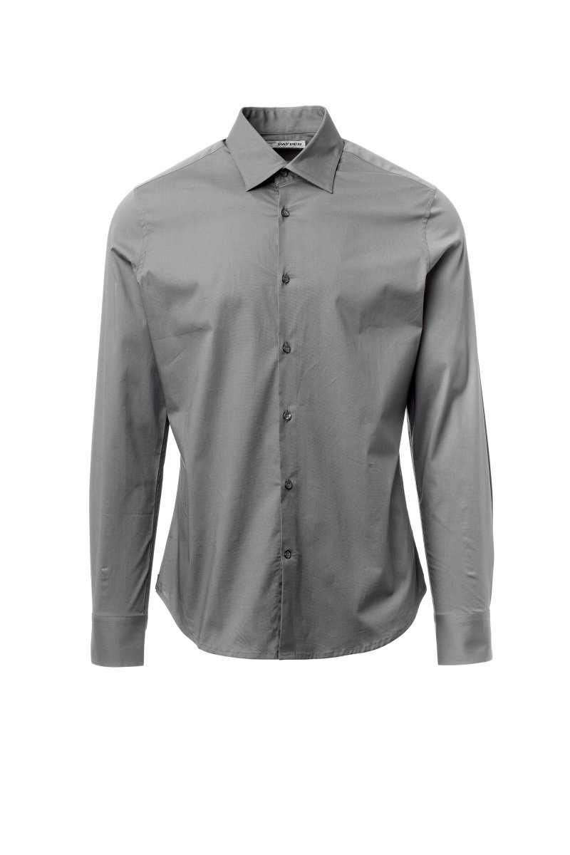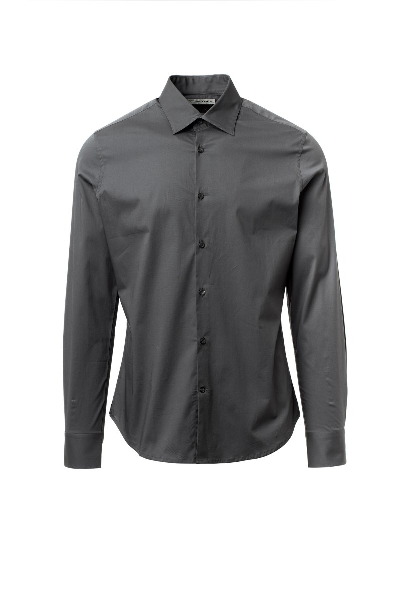 Men's shirt, slim fit. Shaped Italian collar with closed front band tie space and removable stays. Box pleat folded inside and visible buttoning. Mother-of-pearl effect buttons. Smooth yoke on the back. Mid-back tuck pleats. Fabric gusset on the hips. Rounded cuffs with 2 buttons.