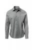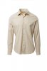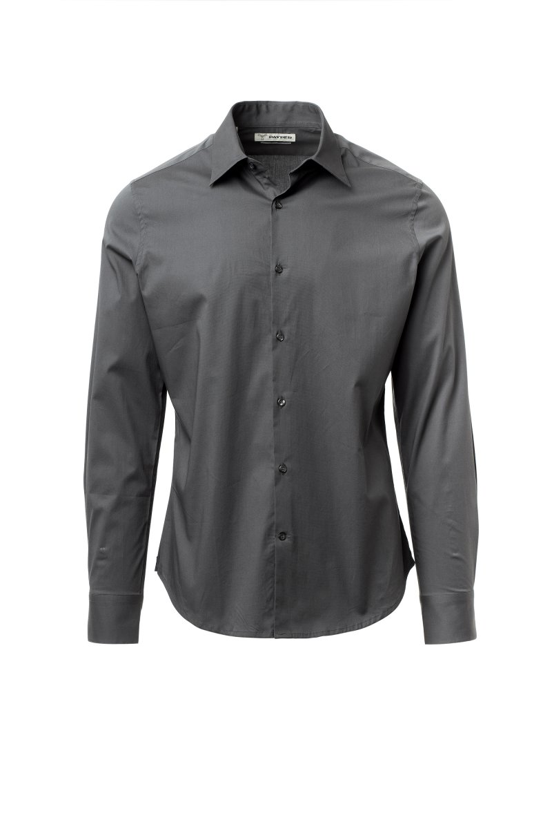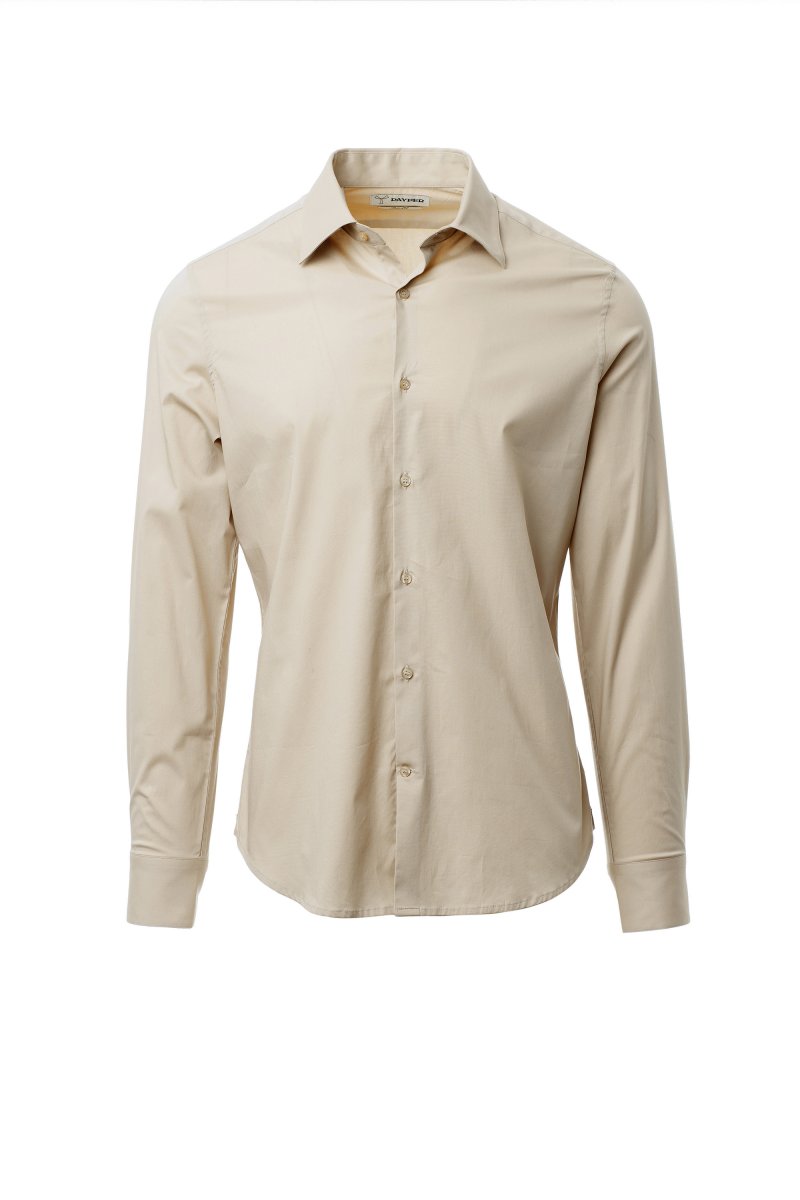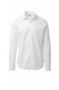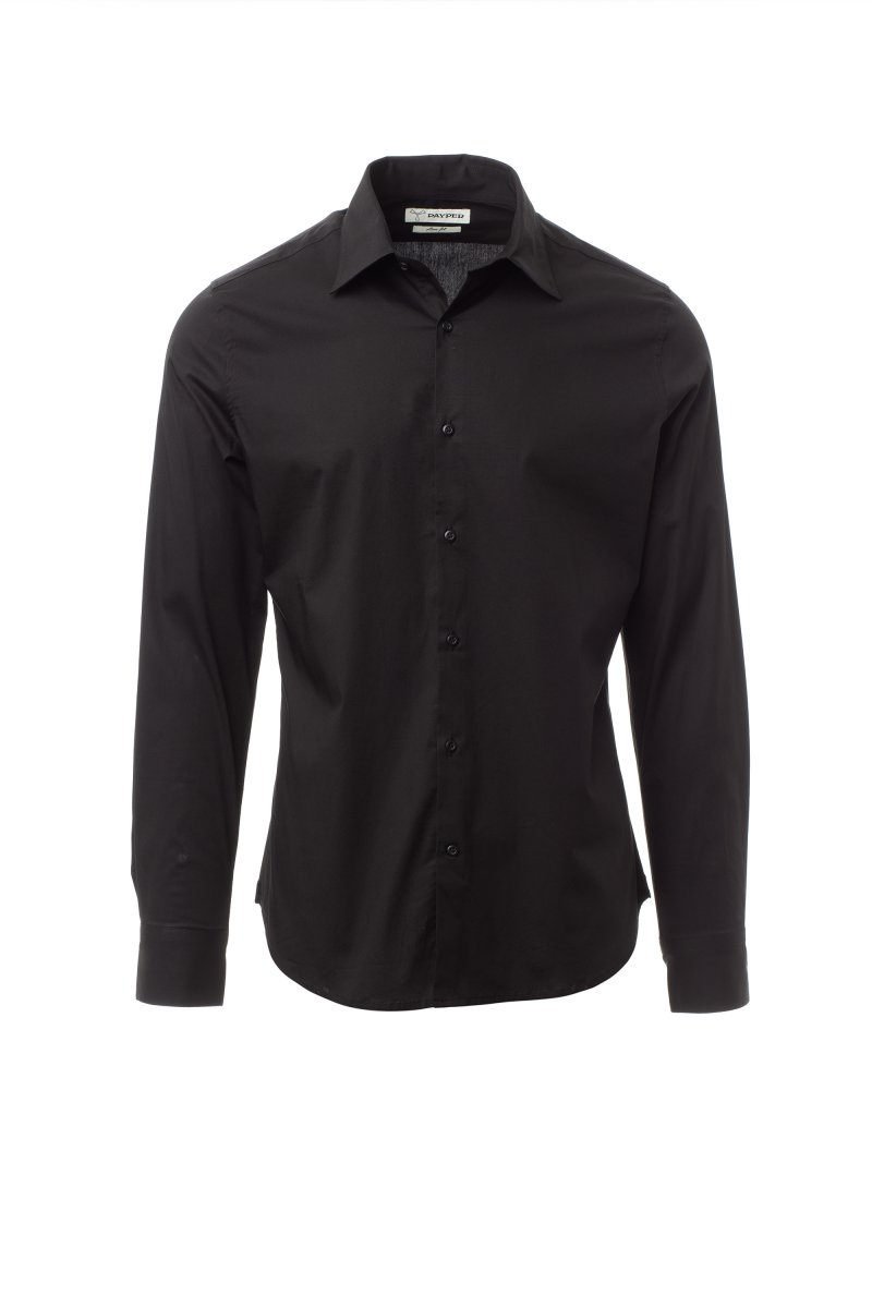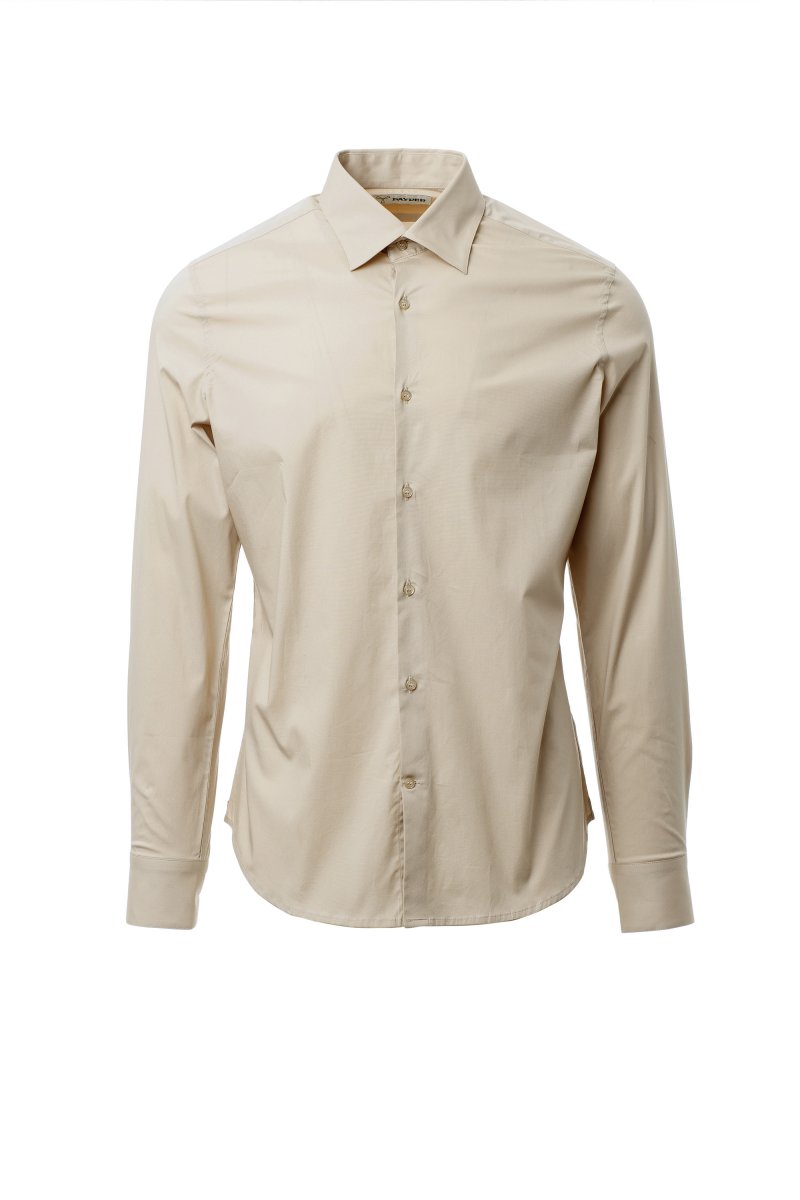 Men's shirt, slim fit. Shaped Italian collar with closed front band tie space and removable stays. Box pleat folded inside and visible buttoning. Mother-of-pearl effect buttons. Smooth yoke on the back. Mid-back tuck pleats. Fabric gusset on the hips. Rounded cuffs with 2 buttons.