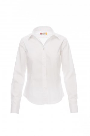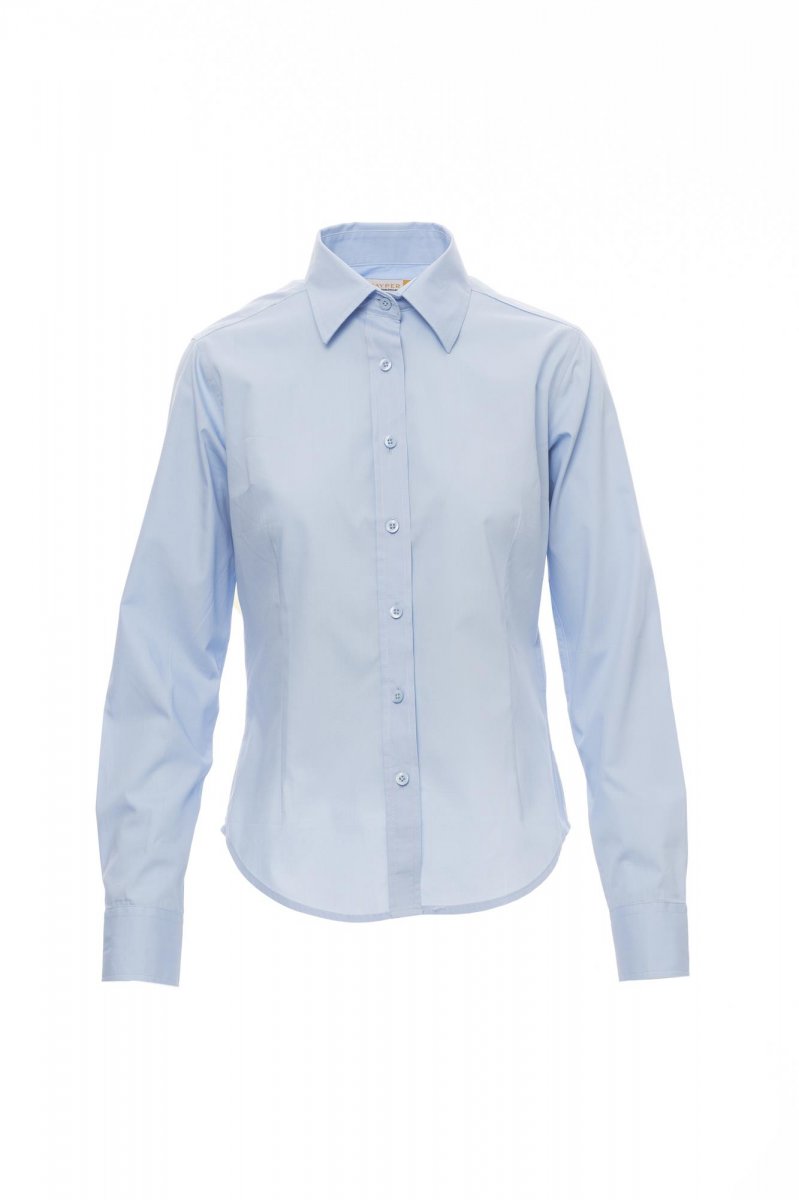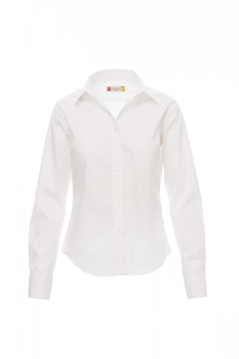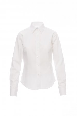 Women’s fine weave combed cotton fitted shirt, pleats at the front and back, Italian-style collar, tailored cuff with 2 buttons and button hole, stitched placket with matching buttons. With yoke,