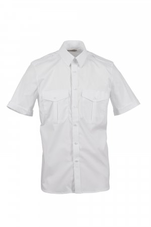 Short-sleeved shirt, contemporary fit. Italian collar. Visible stitched placket. Shoulder tabs. Chest pockets with button flap, 1 pen holder. Stitched yoke and darts on the back. Fabric gusset on the hips.