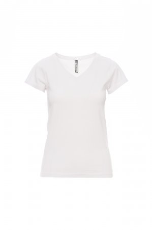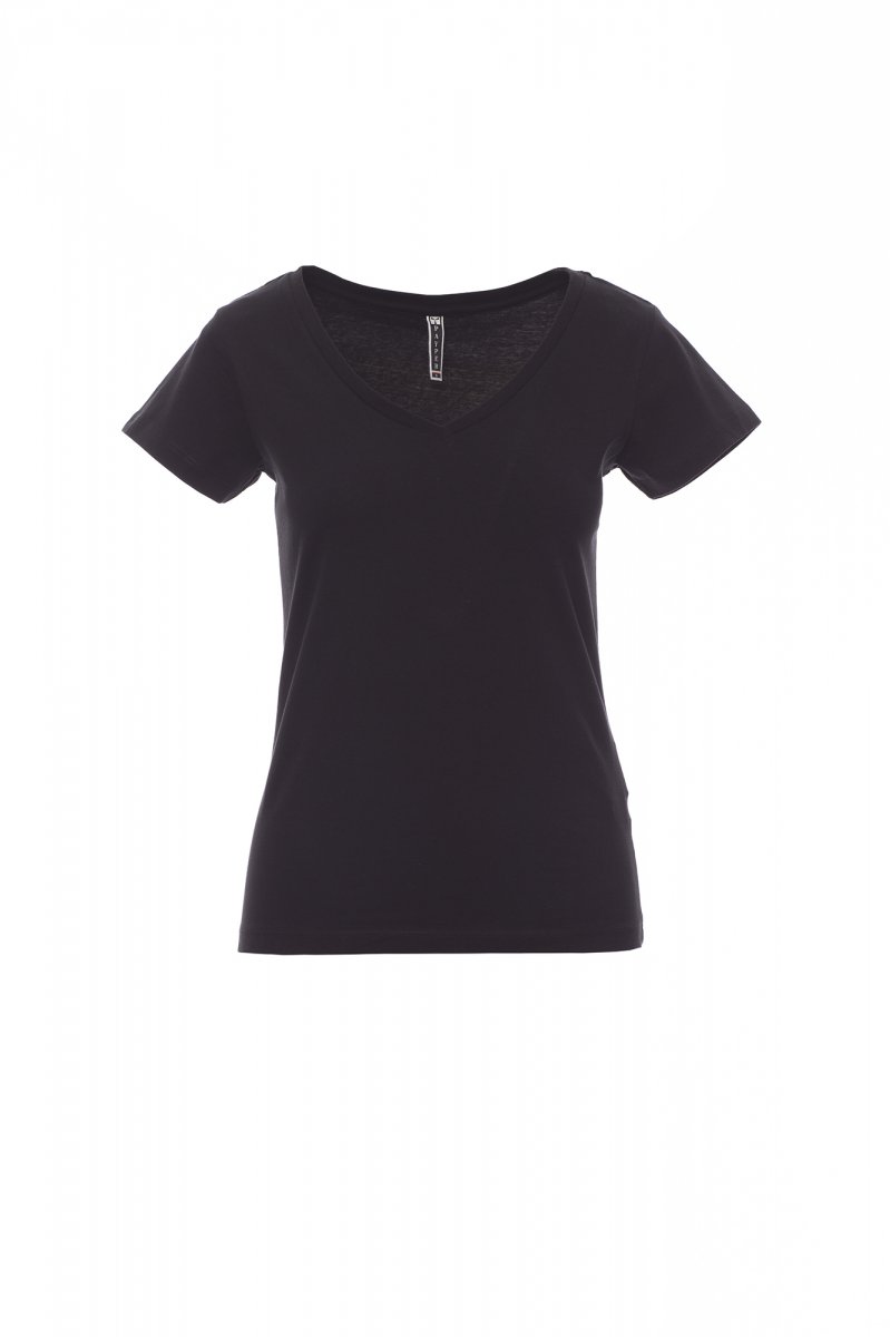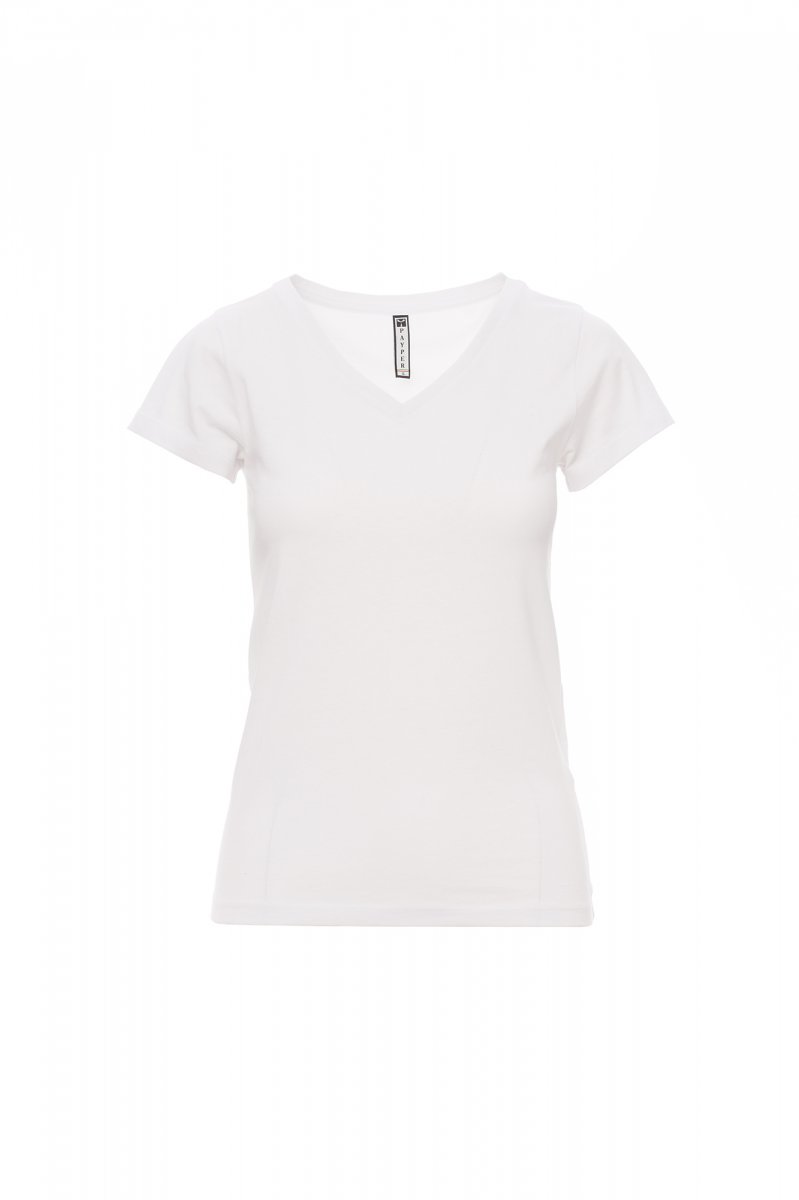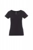 Short sleeve tailoured women’s T-shirt with wide, low spandex mix 1.2 cm V-neck, tight sleeves and side seams for more contoured fit, two needle stitching on shoulders and collar back and cotton taping.