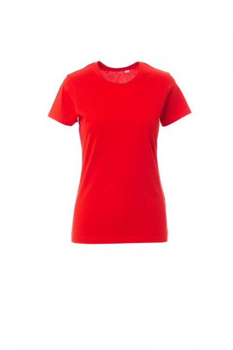 Women’s short-sleeved fitted crew neck t-shirt, with 1.5 cm spandex mix rib neckband with top stitching on the front, shoulder-to-shoulder reinforcement, stretch seams, side seams. No label