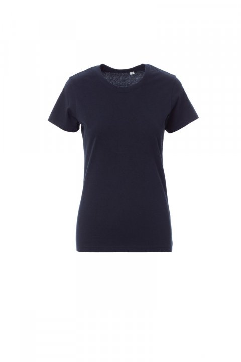 Women’s short-sleeved fitted crew neck t-shirt, with 1.5 cm spandex mix rib neckband with top stitching on the front, shoulder-to-shoulder reinforcement, stretch seams, side seams. No label