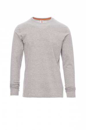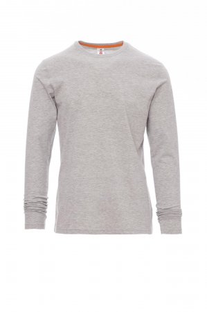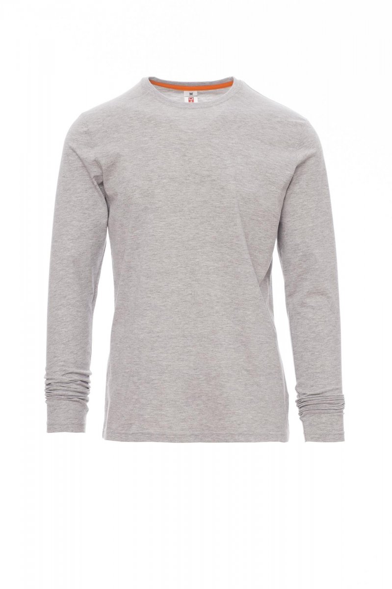Men’s long-sleeved crew neck t-shirt, with 1.5 cm spandex mix rib neckband with top stitching on the front, contrasting shoulder-to-shoulder reinforcement tape visible on the inside collar, stretch seams, side seams