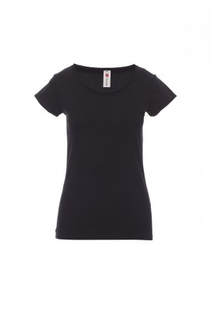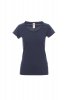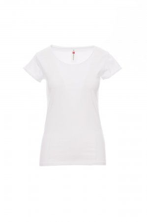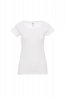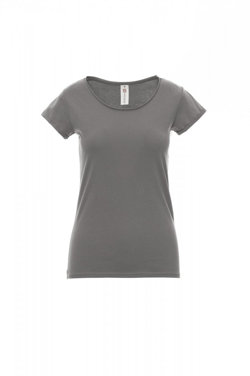 Women’s short-sleeved fitted t-shirt with wide scooped neck, 1.0 cm hem with unfinished edges, shoulders with double-stitched internal seams, short sleeves with unfinished turned-up edges, side seams.