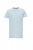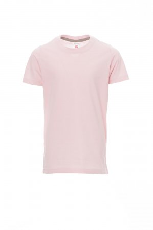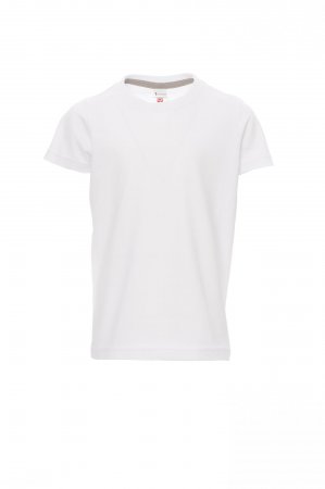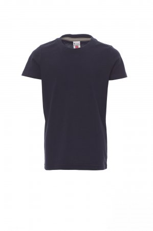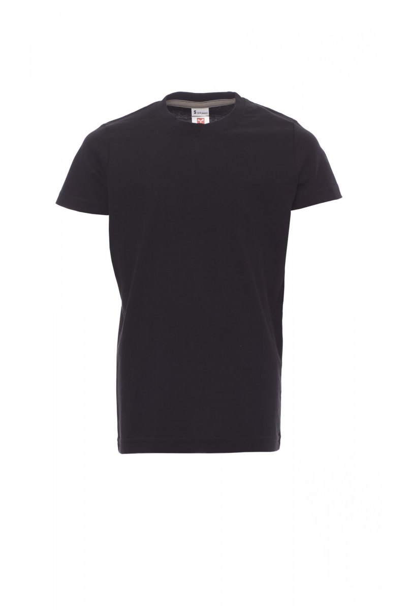 Children’s short-sleeved crew neck t-shirt, with 1.5 cm spandex mix rib neckband with top stitching on the front, contrasting shoulder-to-shoulder reinforcement tape visible on the inside collar, stretch seams, tubular design (camouflage version with side seams)