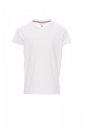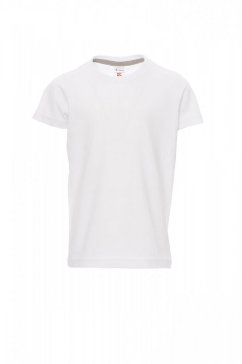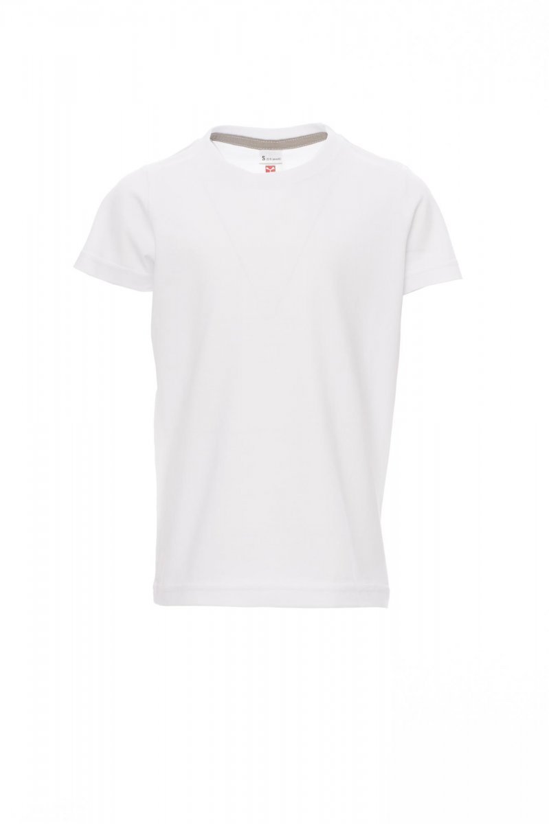 Children’s short-sleeved crew neck t-shirt, with 1.5 cm spandex mix rib neckband with top stitching on the front, contrasting shoulder-to-shoulder reinforcement tape visible on the inside collar, stretch seams, tubular design (camouflage version with side seams)
