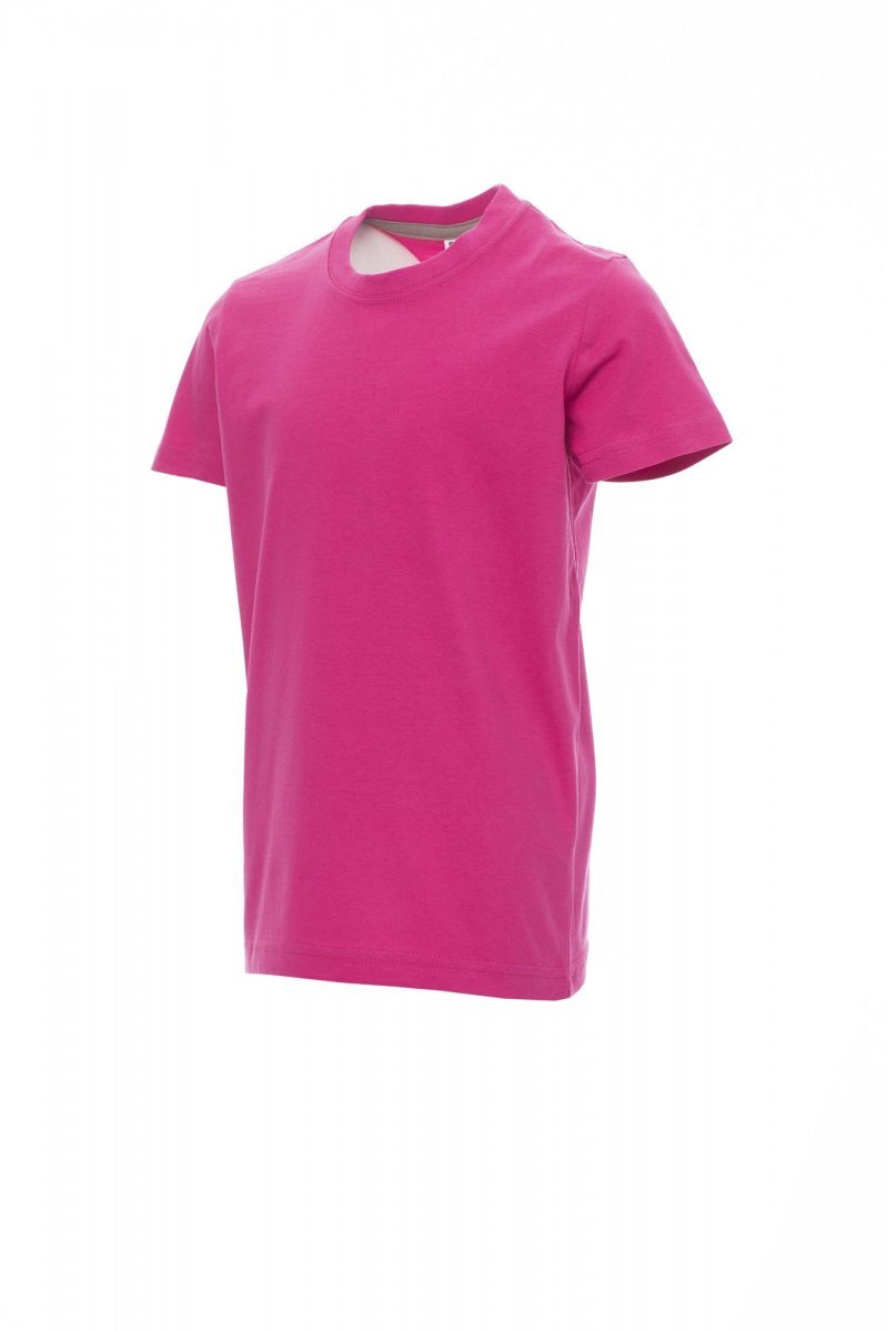 Children’s short-sleeved crew neck t-shirt, with 1.5 cm spandex mix rib neckband with top stitching on the front, contrasting shoulder-to-shoulder reinforcement tape visible on the inside collar, stretch seams, tubular design (camouflage version with side seams)