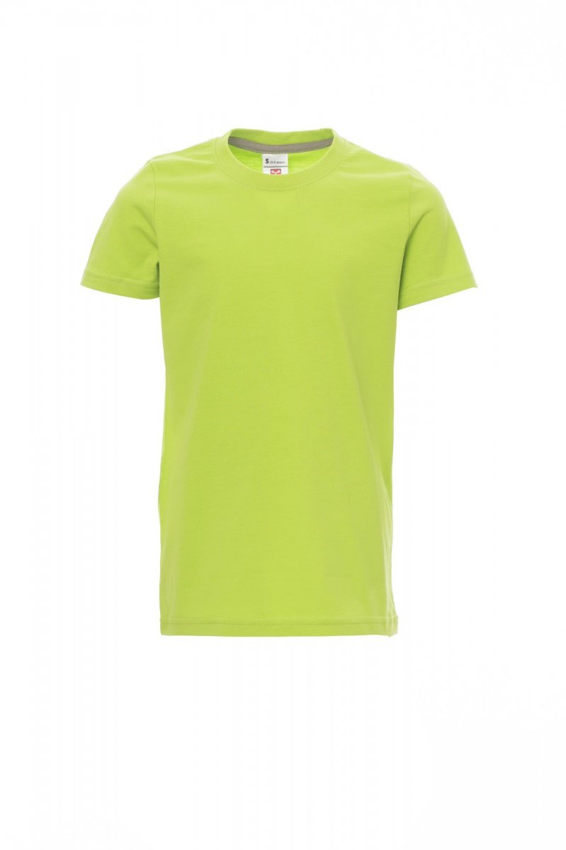 Children’s short-sleeved crew neck t-shirt, with 1.5 cm spandex mix rib neckband with top stitching on the front, contrasting shoulder-to-shoulder reinforcement tape visible on the inside collar, stretch seams, tubular design (camouflage version with side seams)