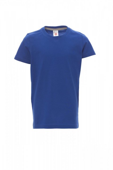 Children’s short-sleeved crew neck t-shirt, with 1.5 cm spandex mix rib neckband with top stitching on the front, contrasting shoulder-to-shoulder reinforcement tape visible on the inside collar, stretch seams, tubular design (camouflage version with side seams)