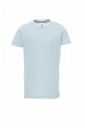 Children’s short-sleeved crew neck t-shirt, with 1.5 cm spandex mix rib neckband with top stitching on the front, contrasting shoulder-to-shoulder reinforcement tape visible on the inside collar, stretch seams, tubular design (camouflage version with side seams)
