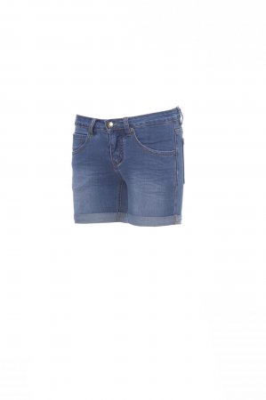 Women’s Bermuda-type jeans with five pockets, metal zip fastening with button, belt loops at waist, leg turn-up, stone wash, worn, faded effect, contrasting heavy duty stitching, double seams on inside leg, straight leg, studs and patches in real leather. Fabric weight: 12 oz/yd².
