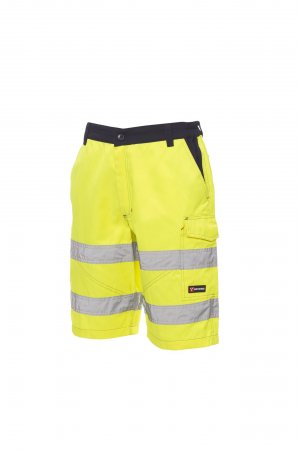 Men’s Bermuda shorts, high visibility with reflective stripes, side elastic and waist belt loops, zip fastening with plastic button, two classic front pockets, one side pocket with LOCK SYSTEM, one tape measure pocket, two back pockets, one with flap and one open with Velcro flap. Contrasting triple seams on the crotch and inside leg.