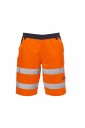 Men's high-visibility shorts with retroreflective strips, side elastics and waist belt loops, zip and plastic button closure. Two classic-cut front pockets, side pocket Lock System, tape measure holder, two back pockets - one open and one with hook-and-loop flap. Contrasting stitching, triple-needle crotch and inner leg seams.